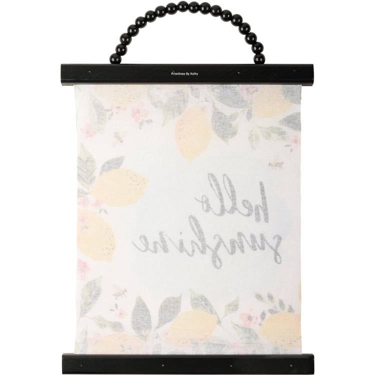 A hanging wall décor piece featuring a watercolor lemon design with hand lettered "Hello Sunshine" sentiment. Canvas art is pulled between two wooden slats and hangs easily via wooden beaded loop.