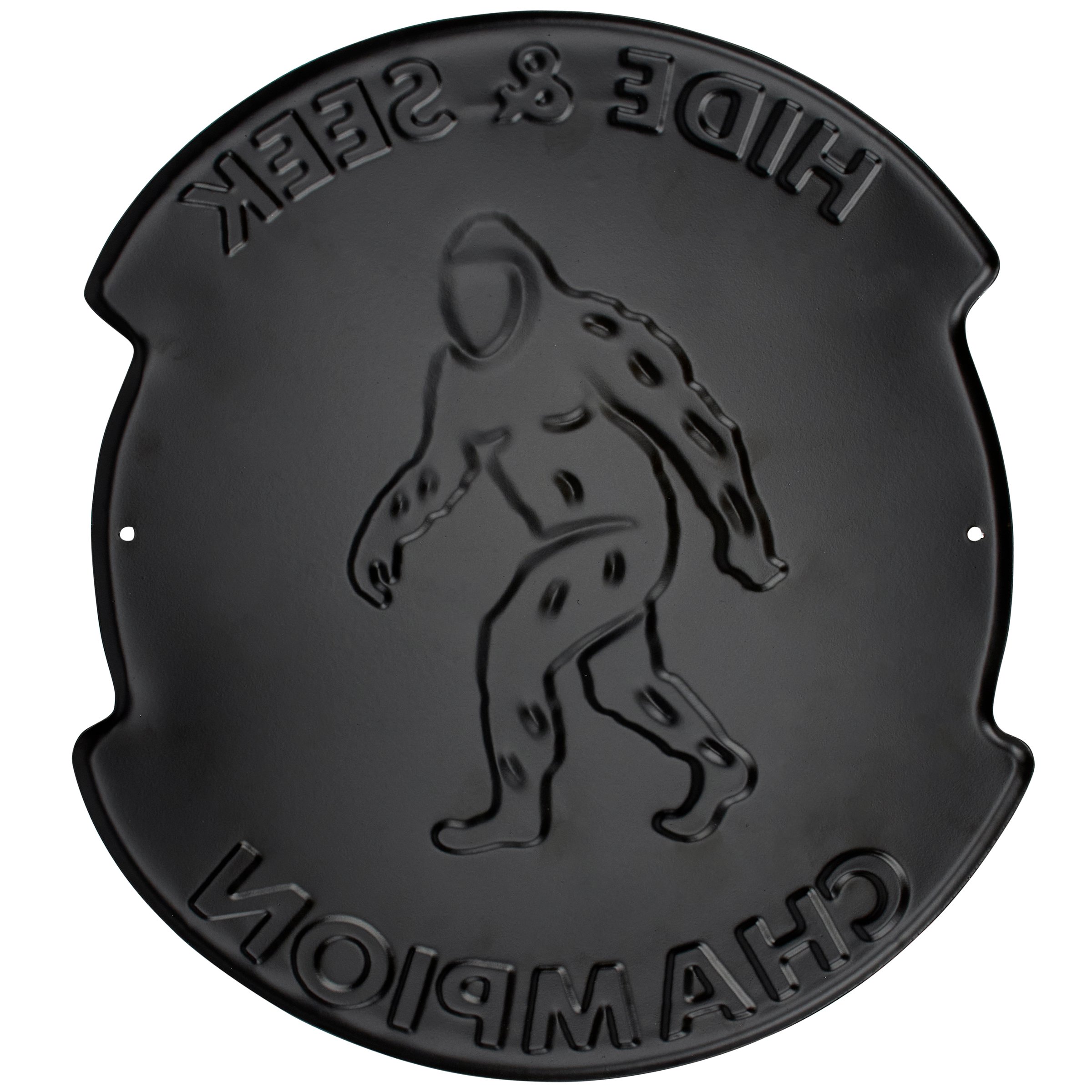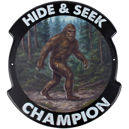 A metal wall décor piece from our Lake & Cabin Collection featuring an emblem design displaying hand painted art of bigfoot with a fun sentiment that reads "Hide & Seek Champion." Bigfoot sign design features embossed and debossed details for added dimension. Our Hide & Seek Champion metal wall décor is easy to hang against wall using the included mounting hardware and pre-drilled holes on each side. A fun bigfoot themed home accent that coordinates well with cabin decor.