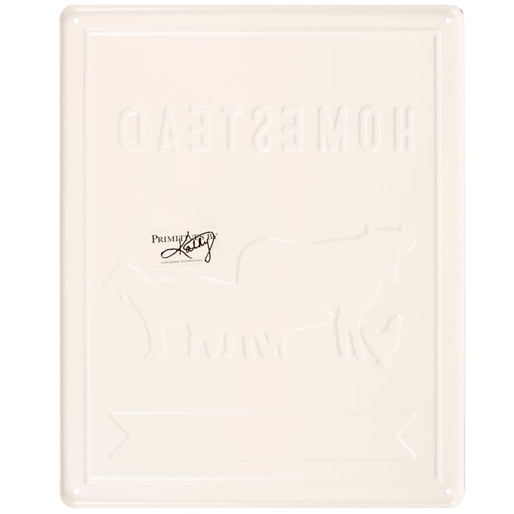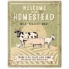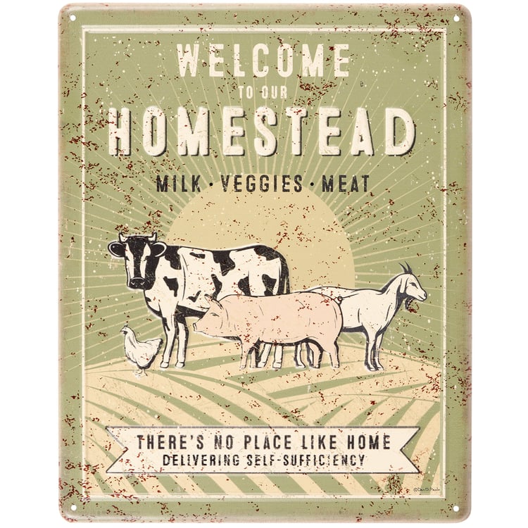 A metal wall décor piece from our Homestead Collection displaying a rustic local farm inspired design of farm animals with a farm-themed sentiment that reads "Welcome To Our Homestead - There Is No Place Like Home - Delivering Self-Sufficiency." Farm sign design features embossed details and a rust finish for an aged appearance. Our Homestead metal wall décor is easy to hang against wall using the included mounting hardware and pre-drilled holes in each corner. A rustic farm-themed home accent perfect for everyday display.