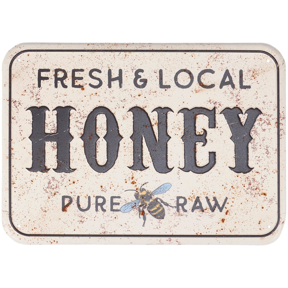A metal wall décor piece from our Homestead Collection displaying a rustic farm inspired sentiment that reads "Fresh & Local Honey." Design features embossed details as well as a rust finish for an aged appearance. Our Honey wall décor is easy to hang against wall using the included nails and pre-drilled holes in each corner. A farm-themed home accent perfect for everyday display.