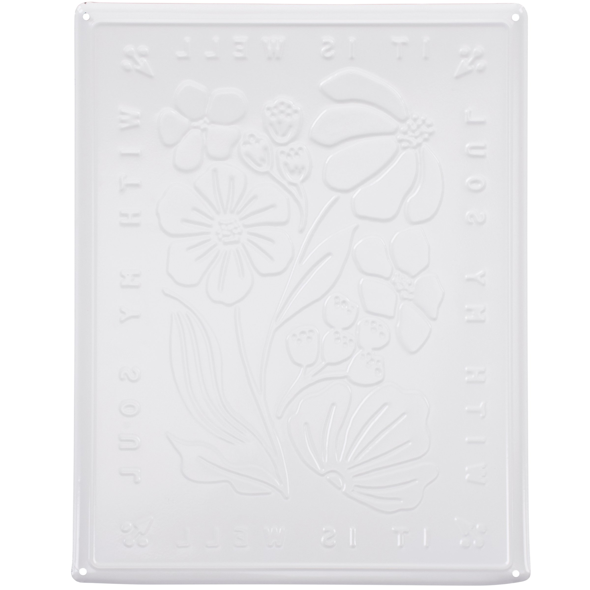 A metal wall décor piece from our Faith Collection displaying a beautiful blue flower design surrounded by an inspirational sentiment that reads "It Is Well With My Soul." Inspirational sign features embossed details for added dimension. Our It Is Well With My Soul metal wall décor is easy to hang against wall using the included mounting hardware and pre-drilled holes in each corner. An inspirational home accent perfect for everyday display.