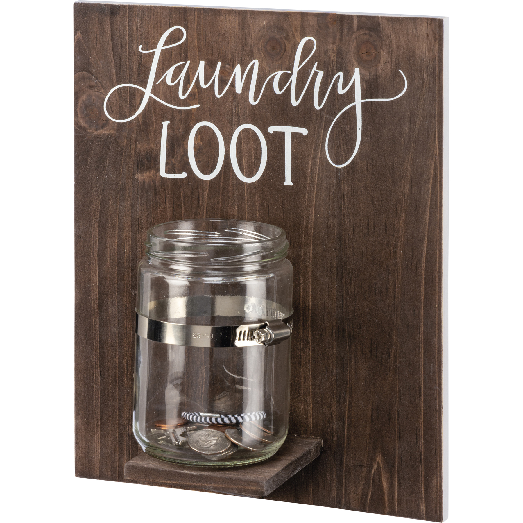 A wooden home sign with an attached glass jar and hand lettered "Laundry Loot" sentiment. Easy to hang via two sawtooth hangers. Perfect for holding loose change from the laundry.