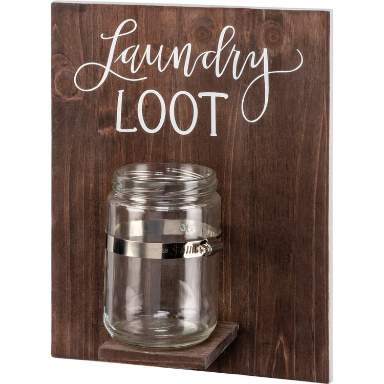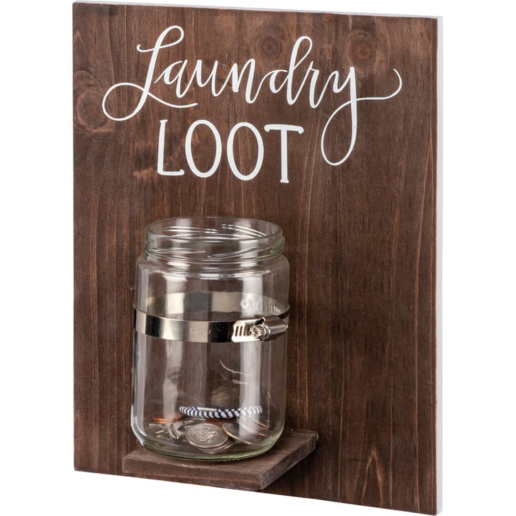 A wooden home sign with an attached glass jar and hand lettered "Laundry Loot" sentiment. Easy to hang via two sawtooth hangers. Perfect for holding loose change from the laundry.