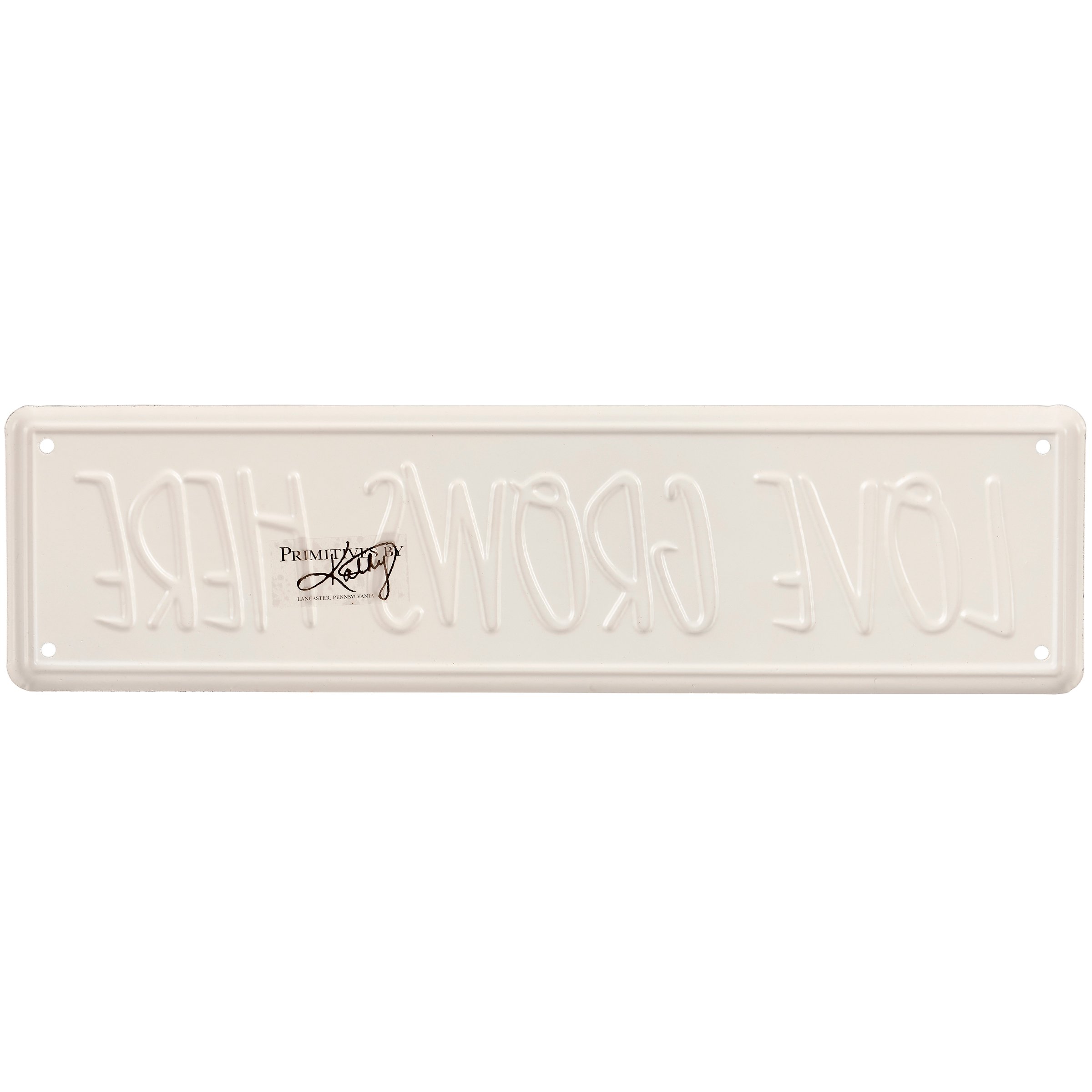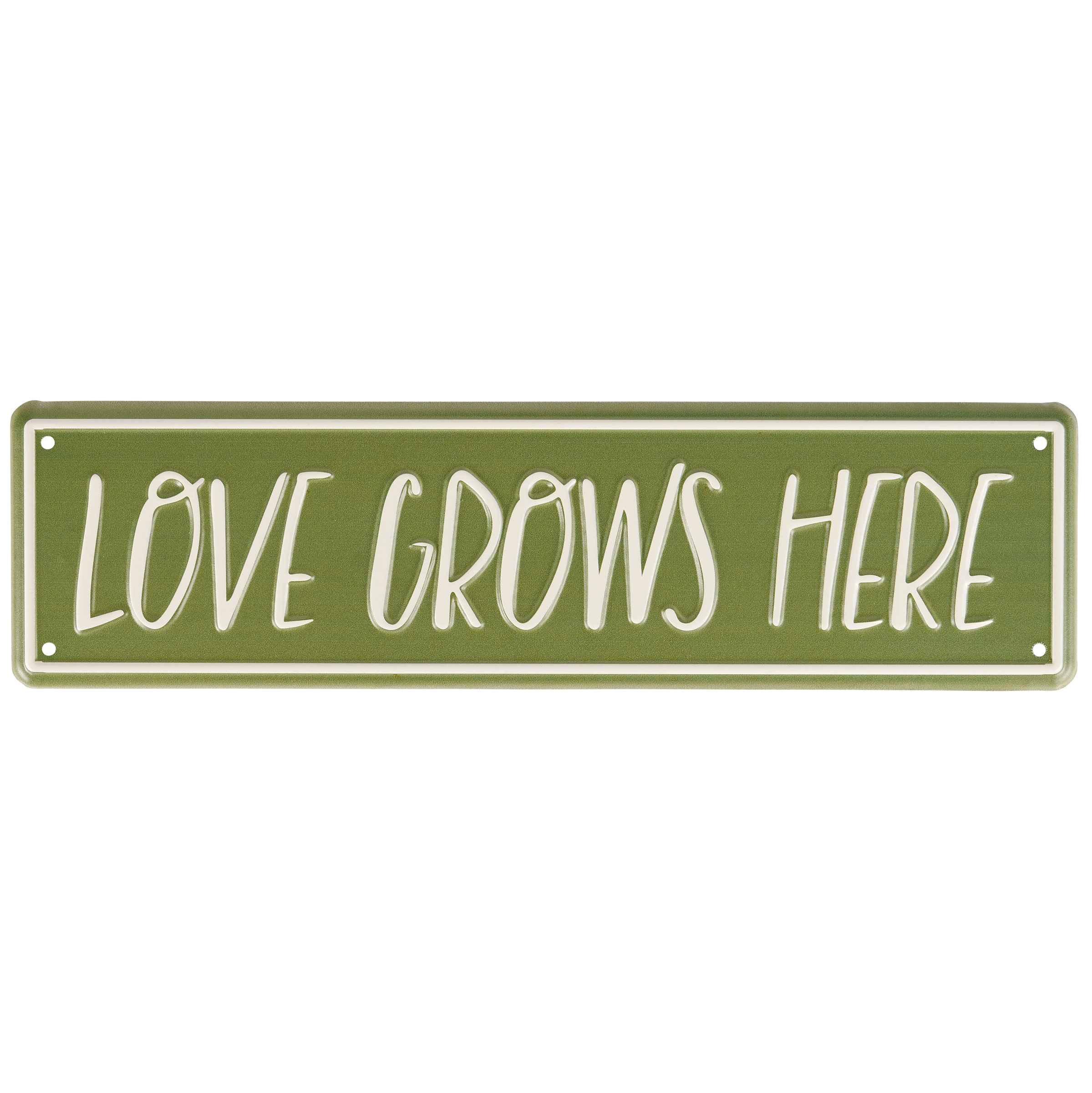 A metal wall décor piece from our Plant Parent Collection displaying an inspirational plant-themed sentiment that reads "Love Grows Here." Plant sign design features embossed details for added dimension. Our Love Grows Here metal wall décor is easy to hang against wall using the included mounting hardware and pre-drilled holes in each corner. An inspirational plant-themed home accent perfect for everyday display.