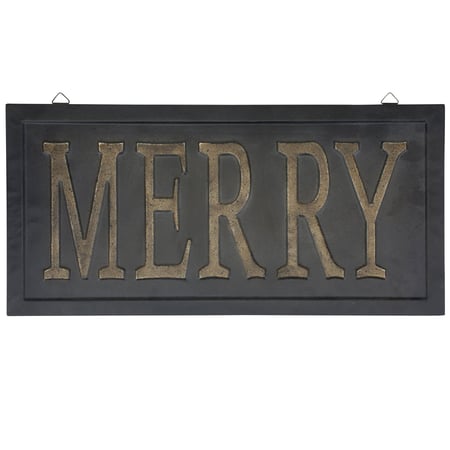 A metal wall décor piece from our Christmas Collection displaying a vintage black sign that displays an embossed seasonal sentiment with distressed details that reads "Merry." Our Merry sign is ready to hang on wall for display via the attached hangers at the top. A vintage Christmas home accent perfect for adding seasonal style to any room.
