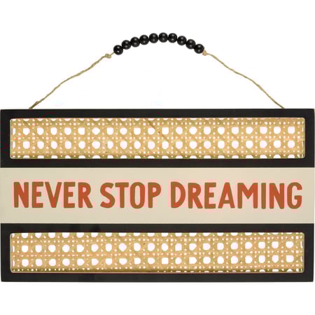 A wooden hanging décor piece featuring a bohemian style design with "Never Stop Dreaming" sentiment and rattan background. Our Never Stop wall décor easily hangs via wooden beaded hanger.