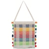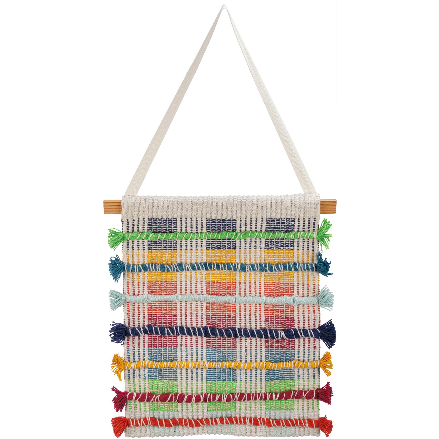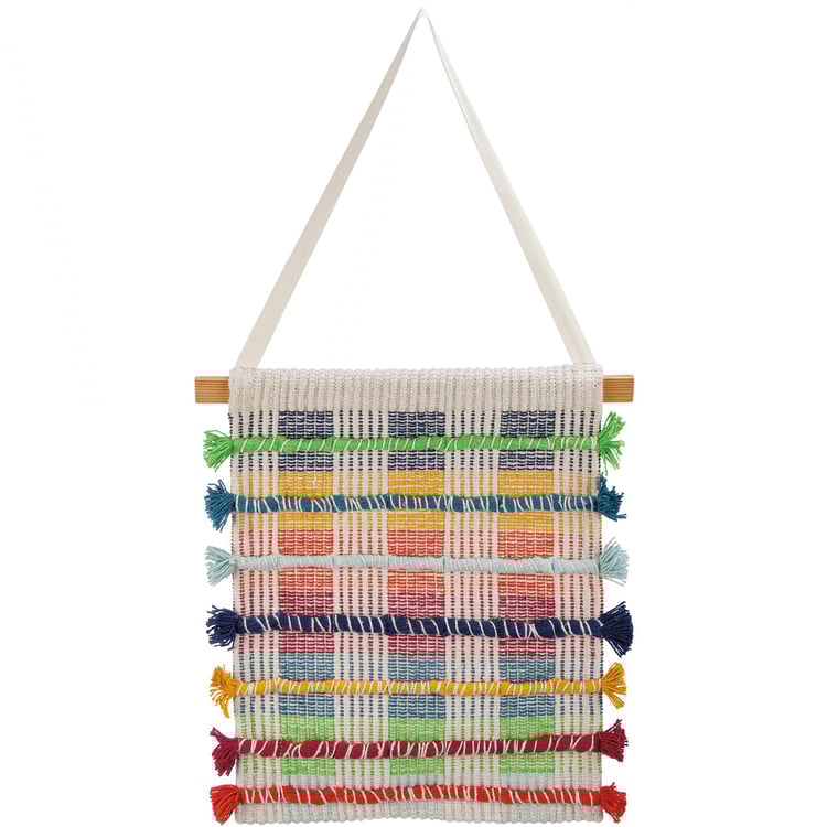 A woven wall hanging from our Plaid Collection featuring a variety of vibrantly colored textiles. Includes fringed edges for added interest. Wall décor is displayed on a wooden rod. Easily hangs by attached cotton tape loop.