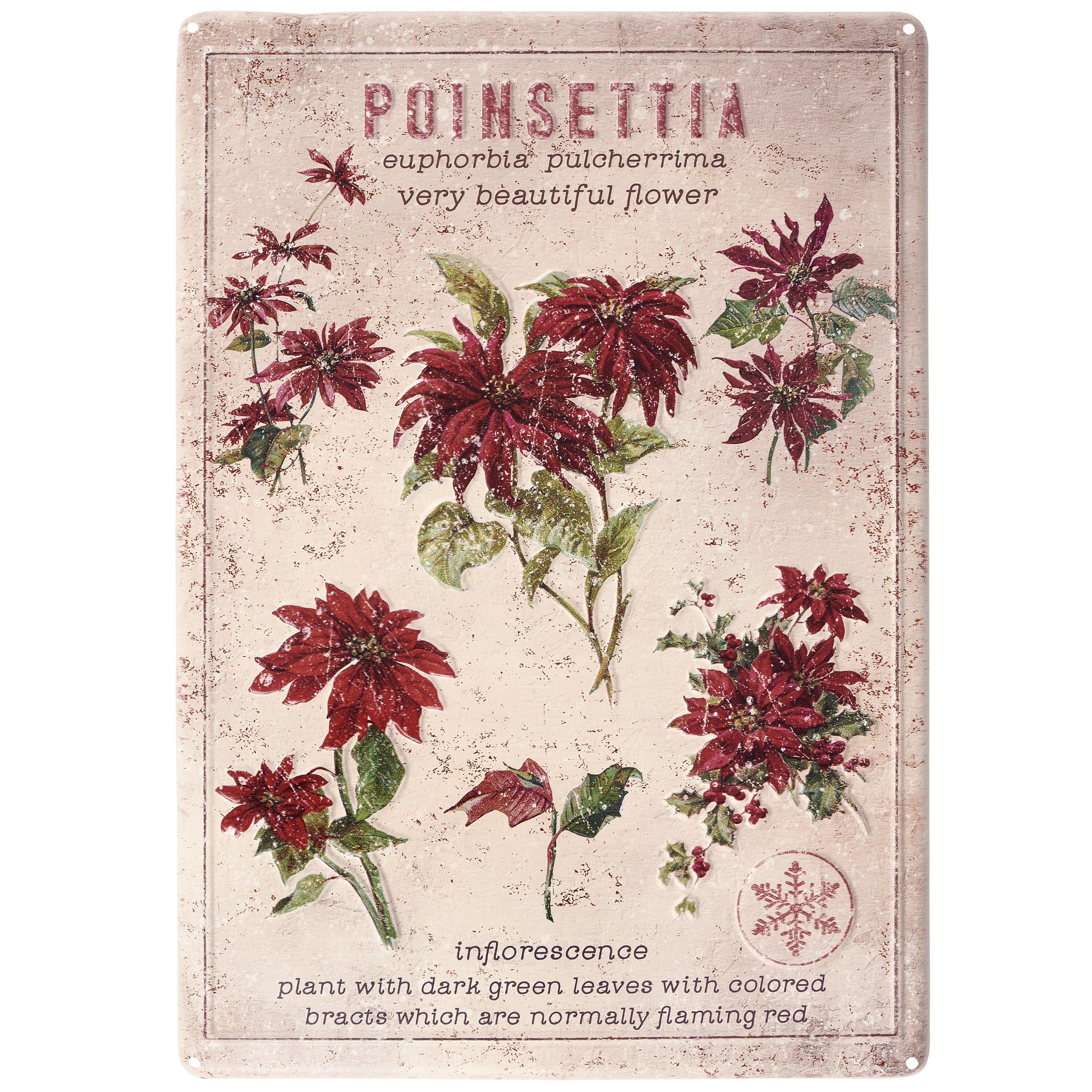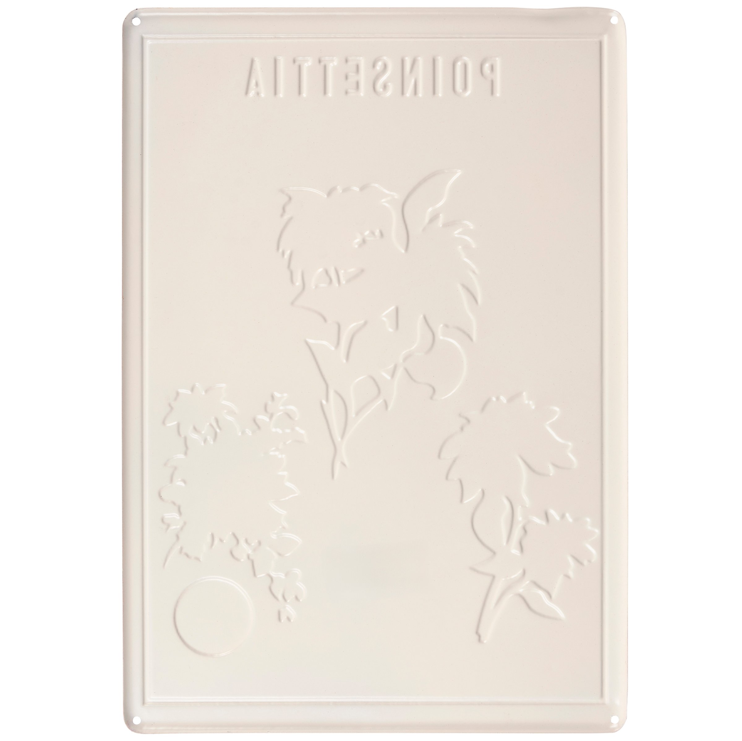 A metal wall décor piece from our Christmas Collection displaying vintage plant study inspired art of poinsettias with embossed details and a rust finish for an aged appearance. Our Poinsettia metal wall décor is easy to hang against wall using the included mounting hardware and pre-drilled holes in each corner. A vintage Christmas home accent perfect for seasonal display.