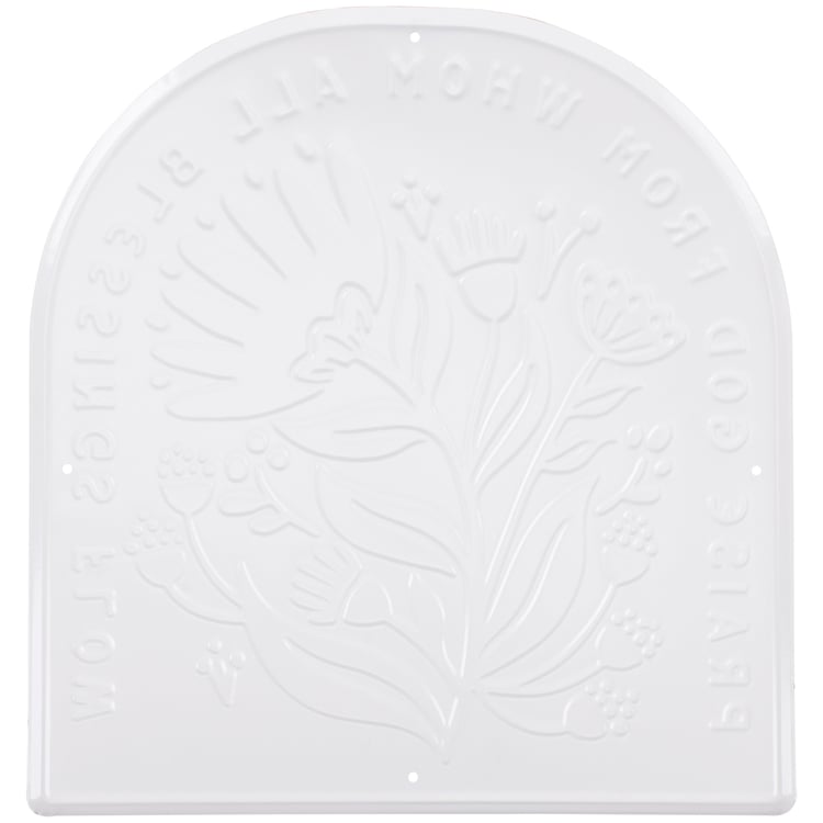 A metal wall décor piece from our Faith Collection displaying a beautiful red flower design surrounded by a faith inspired sentiment that reads "Praise God From Whom All Blessings Flow." Faith sign features embossed details for added dimension. Our Praise God metal wall décor is easy to hang against wall using the included mounting hardware and pre-drilled holes in the top, bottom, and sides. A faith-themed home accent perfect for everyday display.