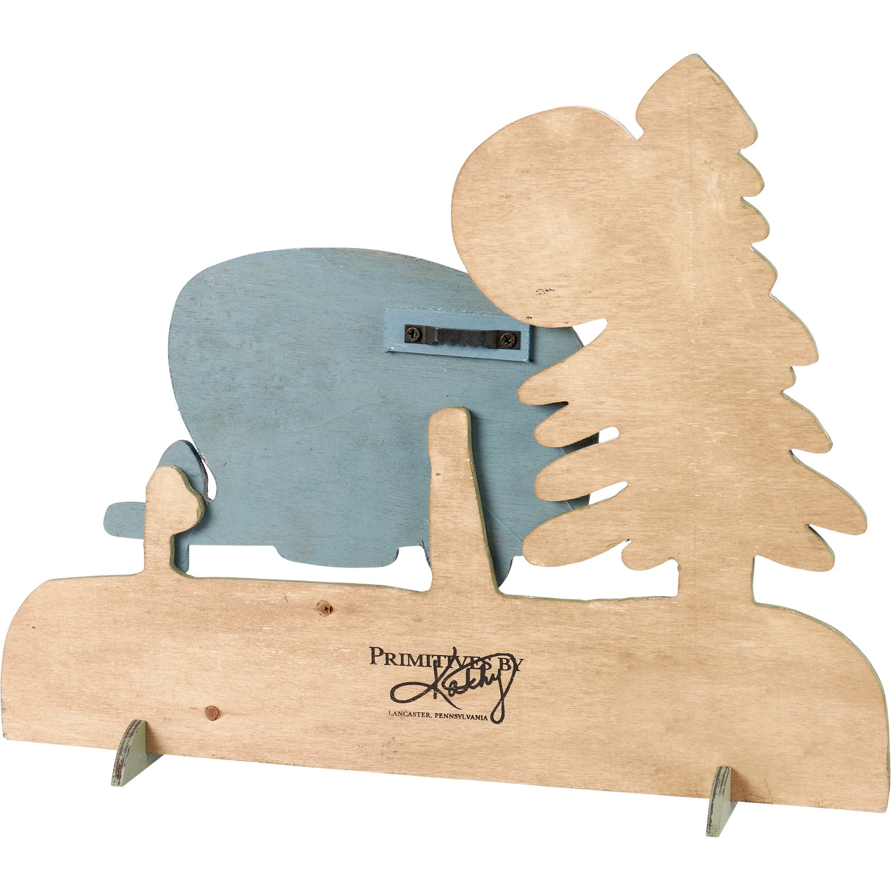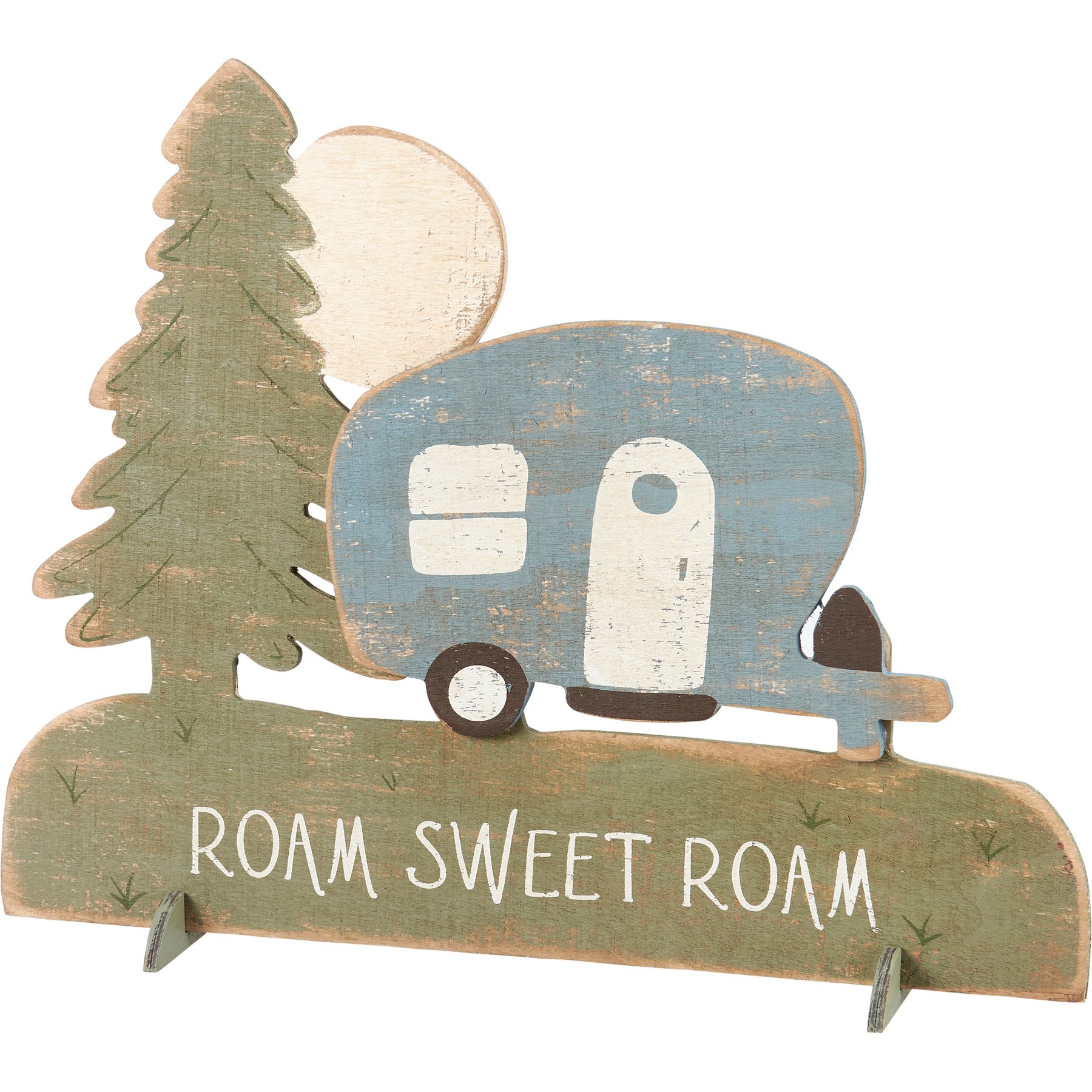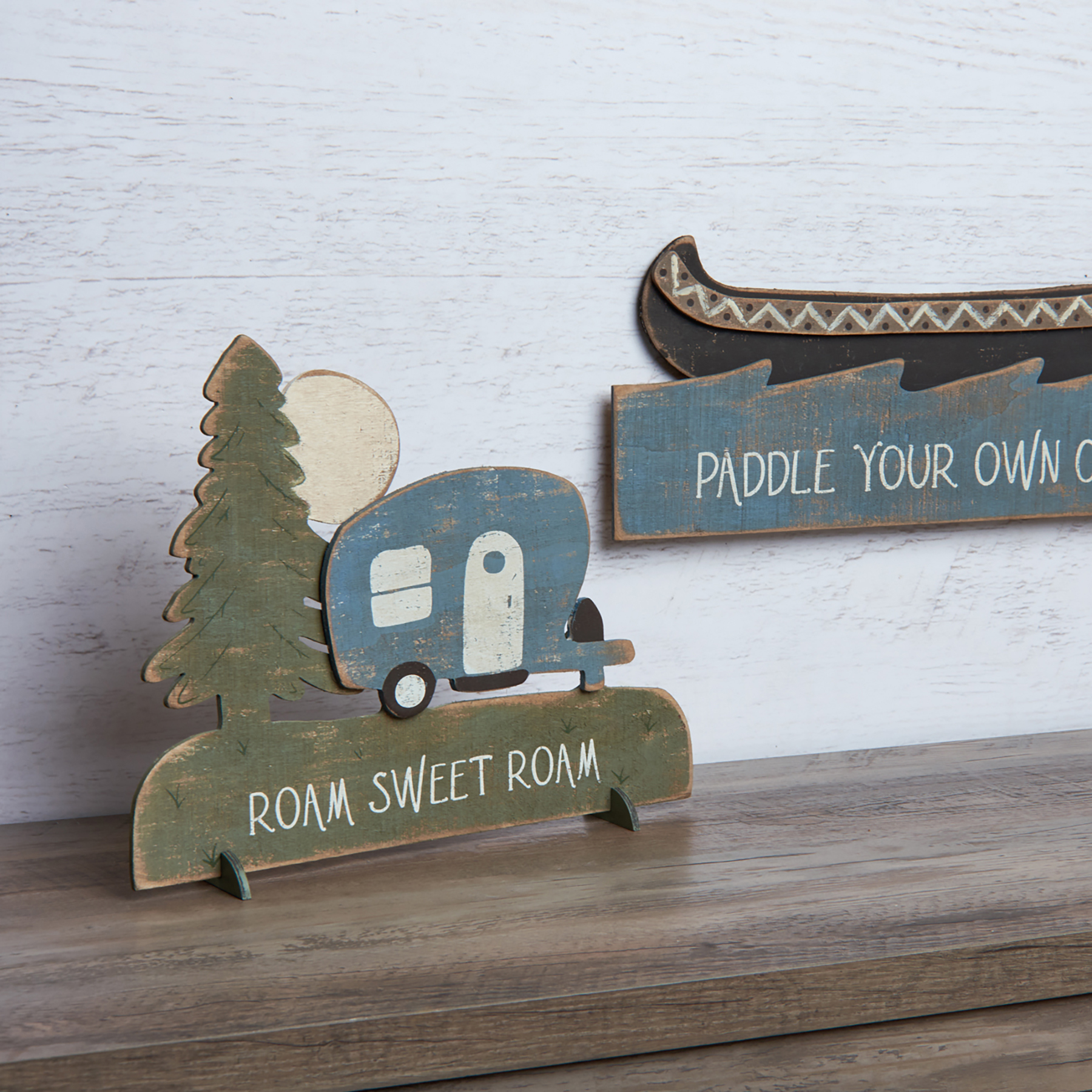A wooden wall décor piece from our Lake & Cabin Collection featuring wood cutouts placed together to create a scene of a camper in the woods with "Roam Sweet Roam" sentiment on the bottom. Our Roam Sweet Roam wall décor is easy to hang via the attached sawtooth hanger or sit using included stands.. A charming everyday home accent perfect for an outdoor theme.