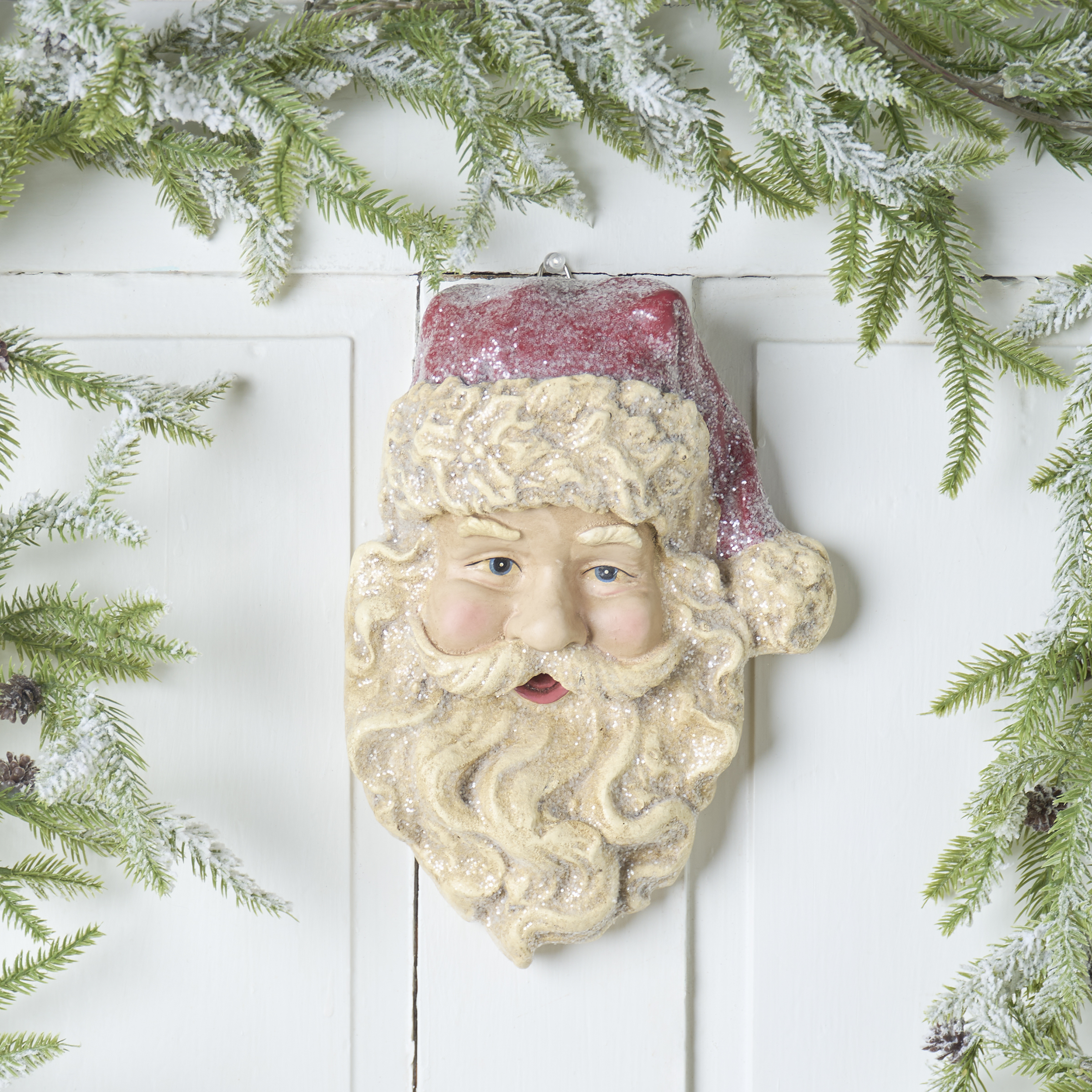A wall décor piece from our Christmas Collection displaying a sculpted Santa face design in a vintage style with painted details and mica coating for a frosty finish. Our Santa Face wall décor is easy to hang for display using the attached metal hanger. A vintage Christmas home accent perfect for seasonal decorating.