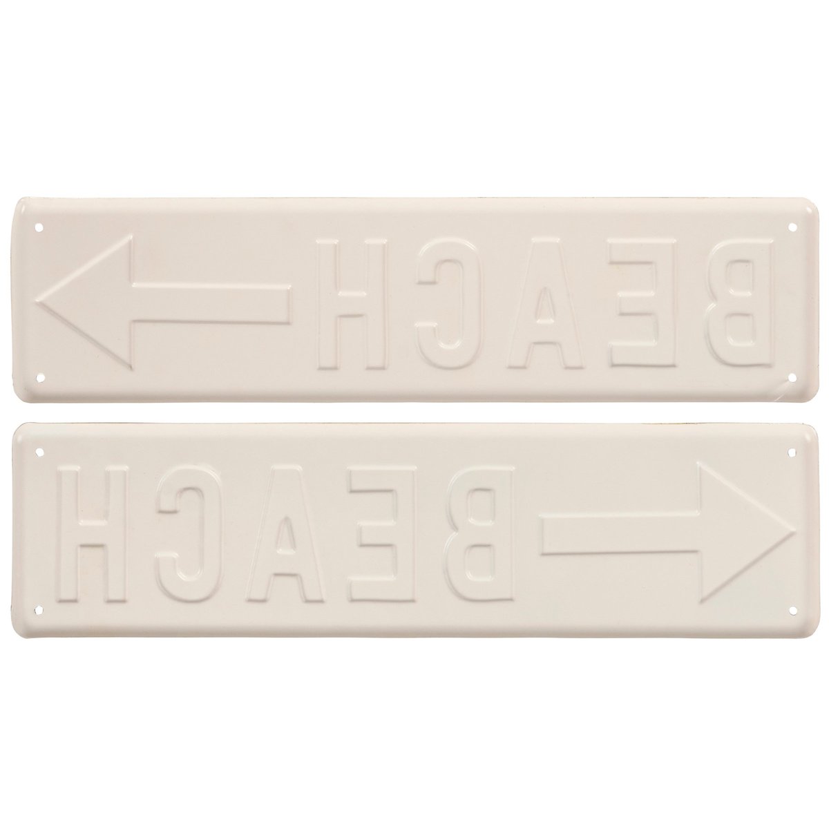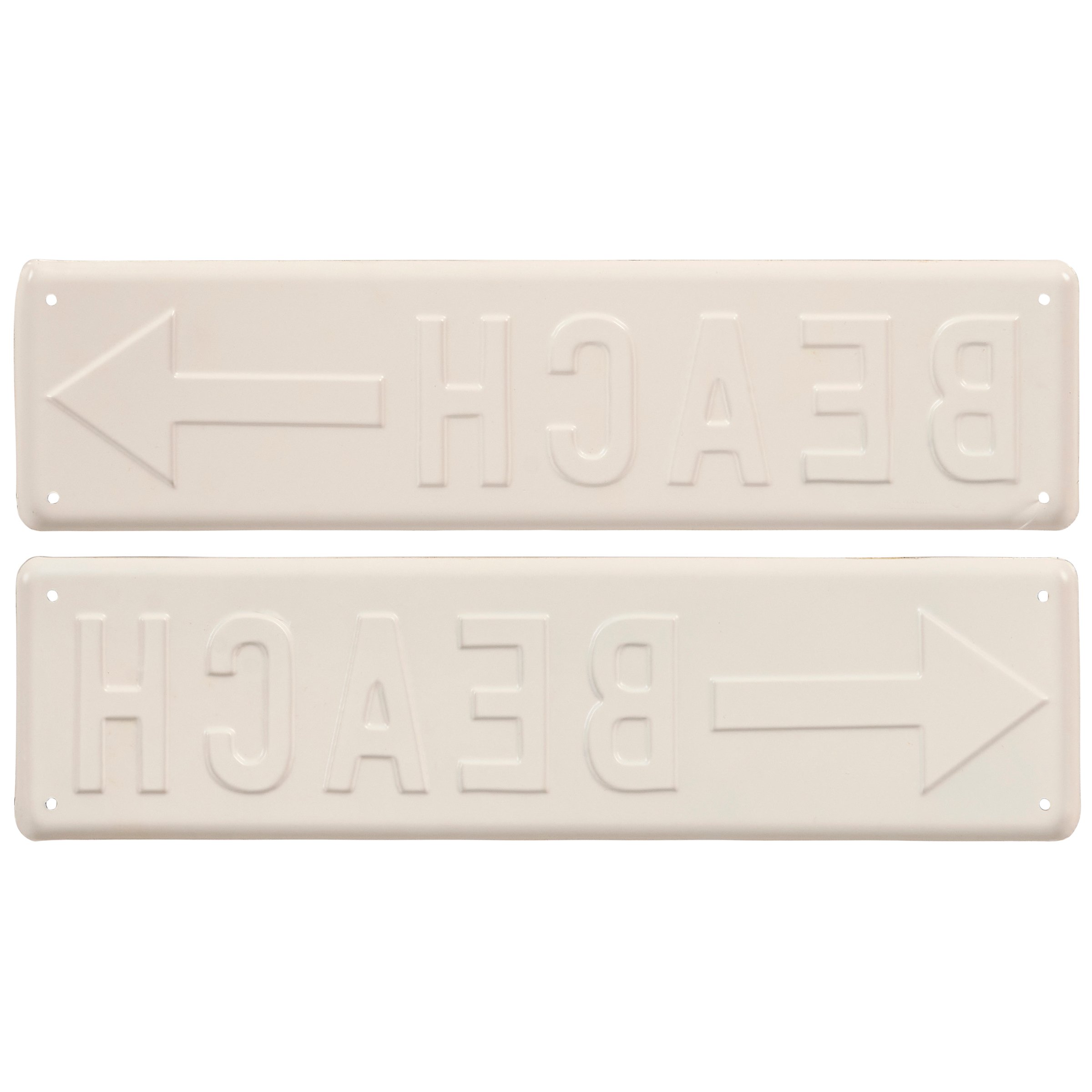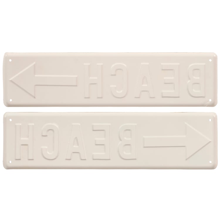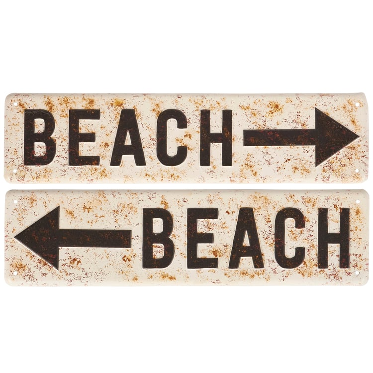 A set of metal wall décor pieces from our Beach Collection displaying beach sign inspired designs on each with arrows point in opposite directions. Beach sign designs feature embossed details and a rust finish for an aged appearance. Our Beach metal wall décor set is easy to hang against wall using the included mounting hardware and pre-drilled holes in each corner. A set of rustic beach-themed home accents perfect for everyday display.