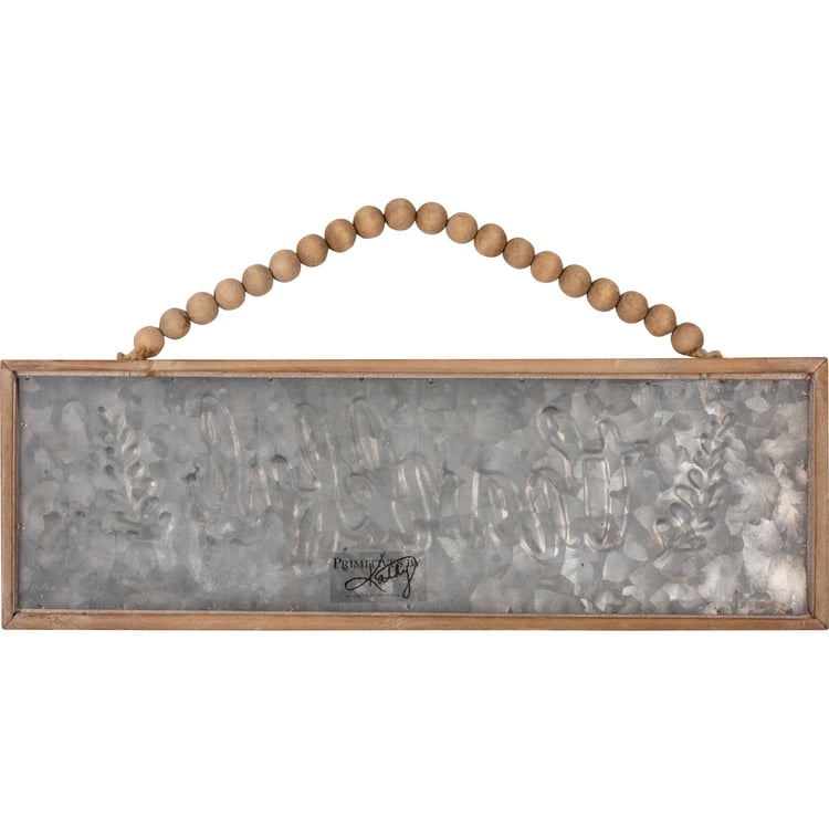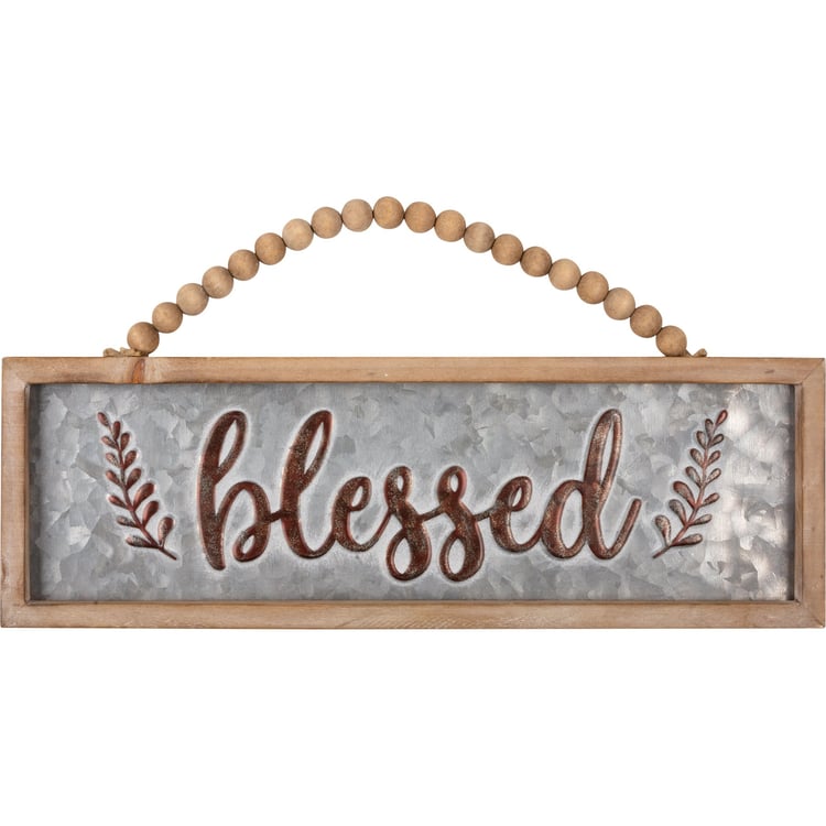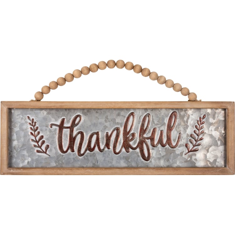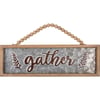 A set of three wooden wall décor pieces featuring metal backgrounds with embossed details and "Thankful," "Blessed," and "Gather" sentiments. Our Thankful Wall Décor Set pieces easily hang via beaded hangers.
