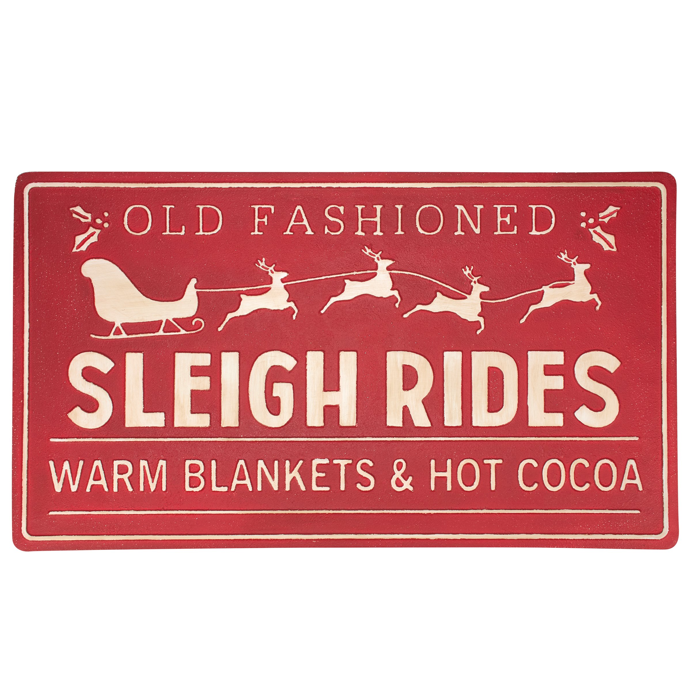 A metal wall décor piece from our Christmas Collection displaying a rustic sleigh ride sign inspired design with sentiment that reads "Old Fashioned Sleigh Rides - Warm Blankets & Hot Cocoa. Sleigh ride sign design features embossed details for added dimension. Our Sleigh Rides metal wall décor is easy to hang against wall via keyhole slot hangers on the back. A rustic Christmas home accent perfect for seasonal display.