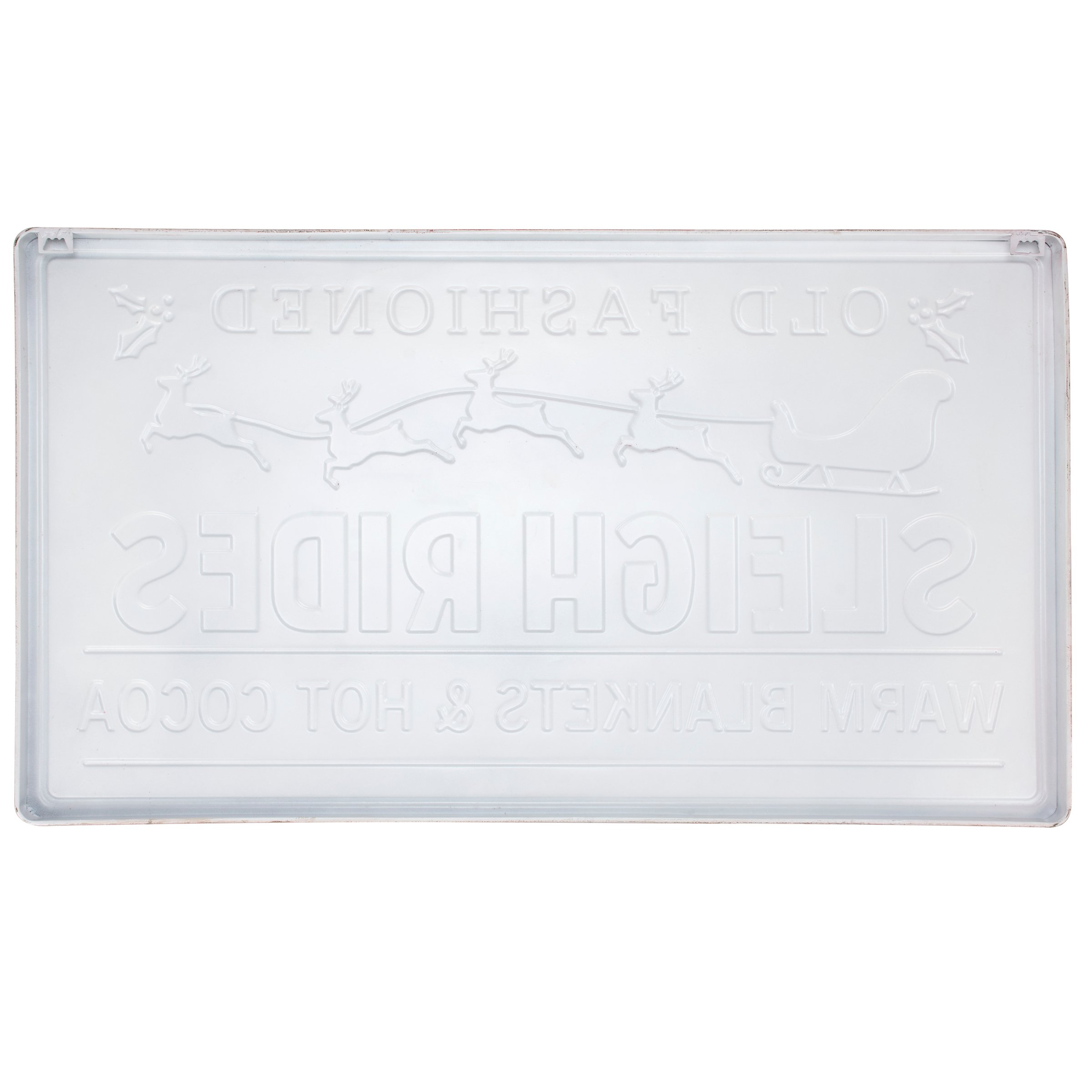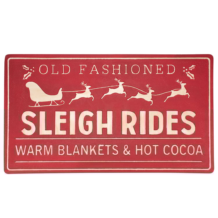 A metal wall décor piece from our Christmas Collection displaying a rustic sleigh ride sign inspired design with sentiment that reads "Old Fashioned Sleigh Rides - Warm Blankets & Hot Cocoa. Sleigh ride sign design features embossed details for added dimension. Our Sleigh Rides metal wall décor is easy to hang against wall via keyhole slot hangers on the back. A rustic Christmas home accent perfect for seasonal display.