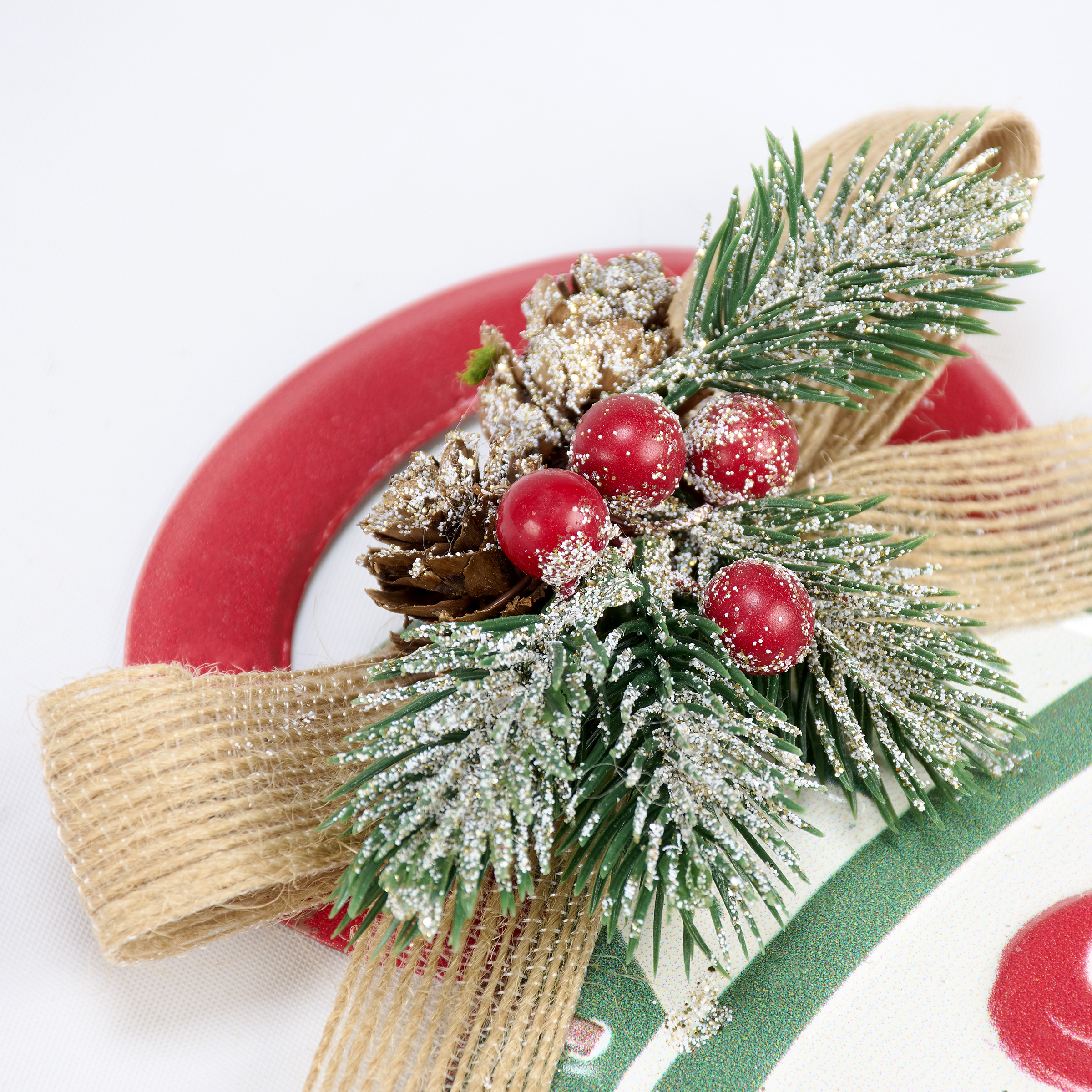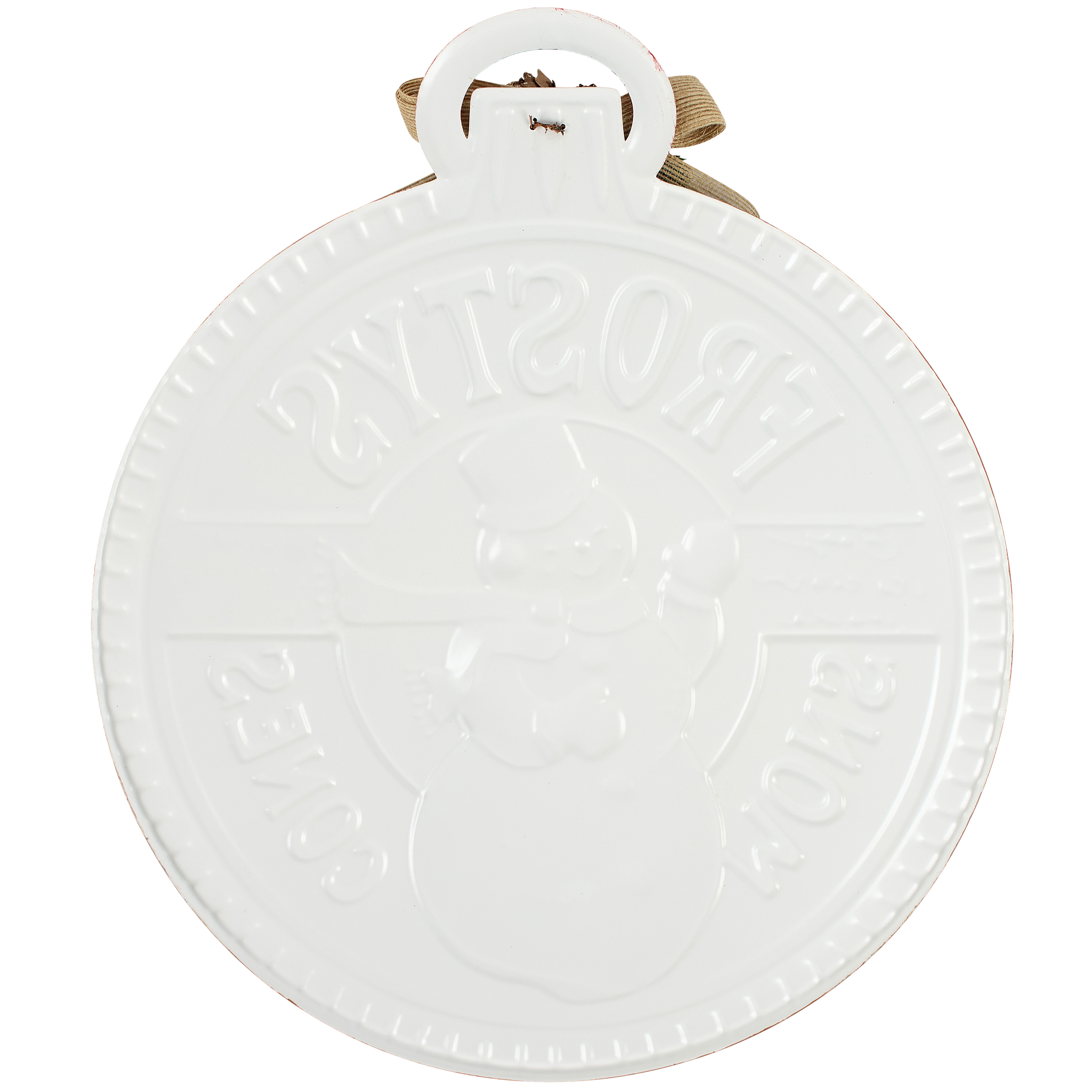 A metal wall decor piece from our Christmas Collection displaying an ornament shaped cutout with a fun retro snowman design and sentiment that reads "Frosty's Snow Cones." Snow cone sign features an accent of pine and burlap with mica coating for a frosty finish. Our Snow Cones wall decor is easy to hang for display via the top loop of the ornament shape. A fun retro Christmas home accent perfect for seasonal display.