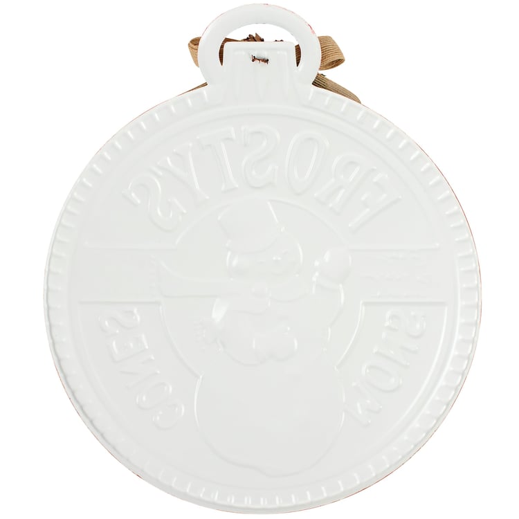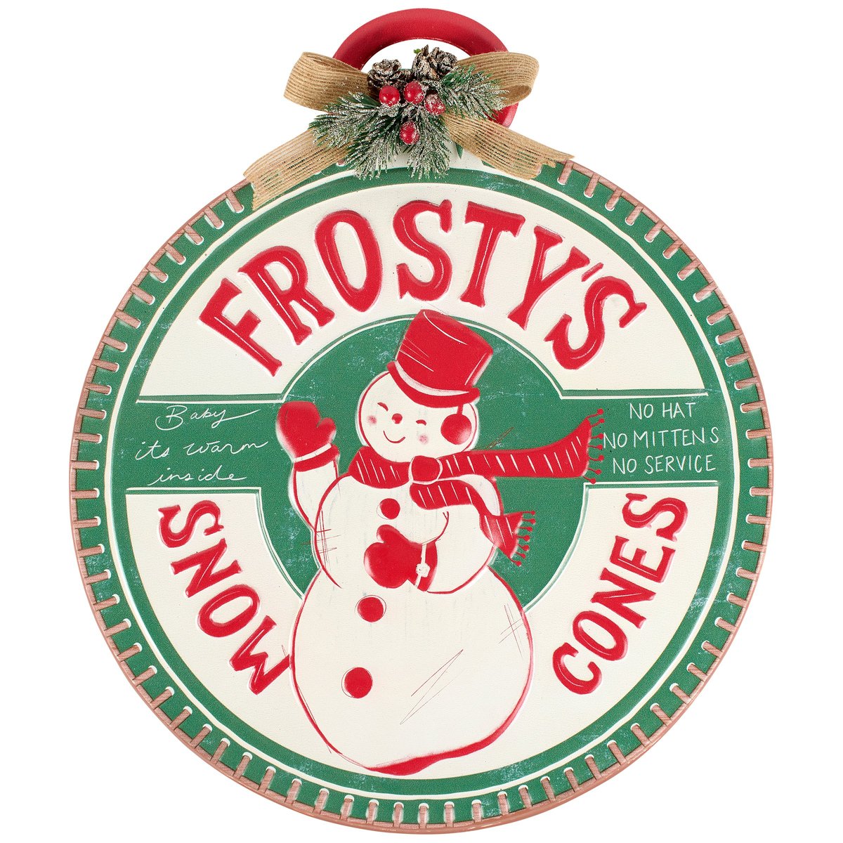 A metal wall decor piece from our Christmas Collection displaying an ornament shaped cutout with a fun retro snowman design and sentiment that reads "Frosty's Snow Cones." Snow cone sign features an accent of pine and burlap with mica coating for a frosty finish. Our Snow Cones wall decor is easy to hang for display via the top loop of the ornament shape. A fun retro Christmas home accent perfect for seasonal display.
