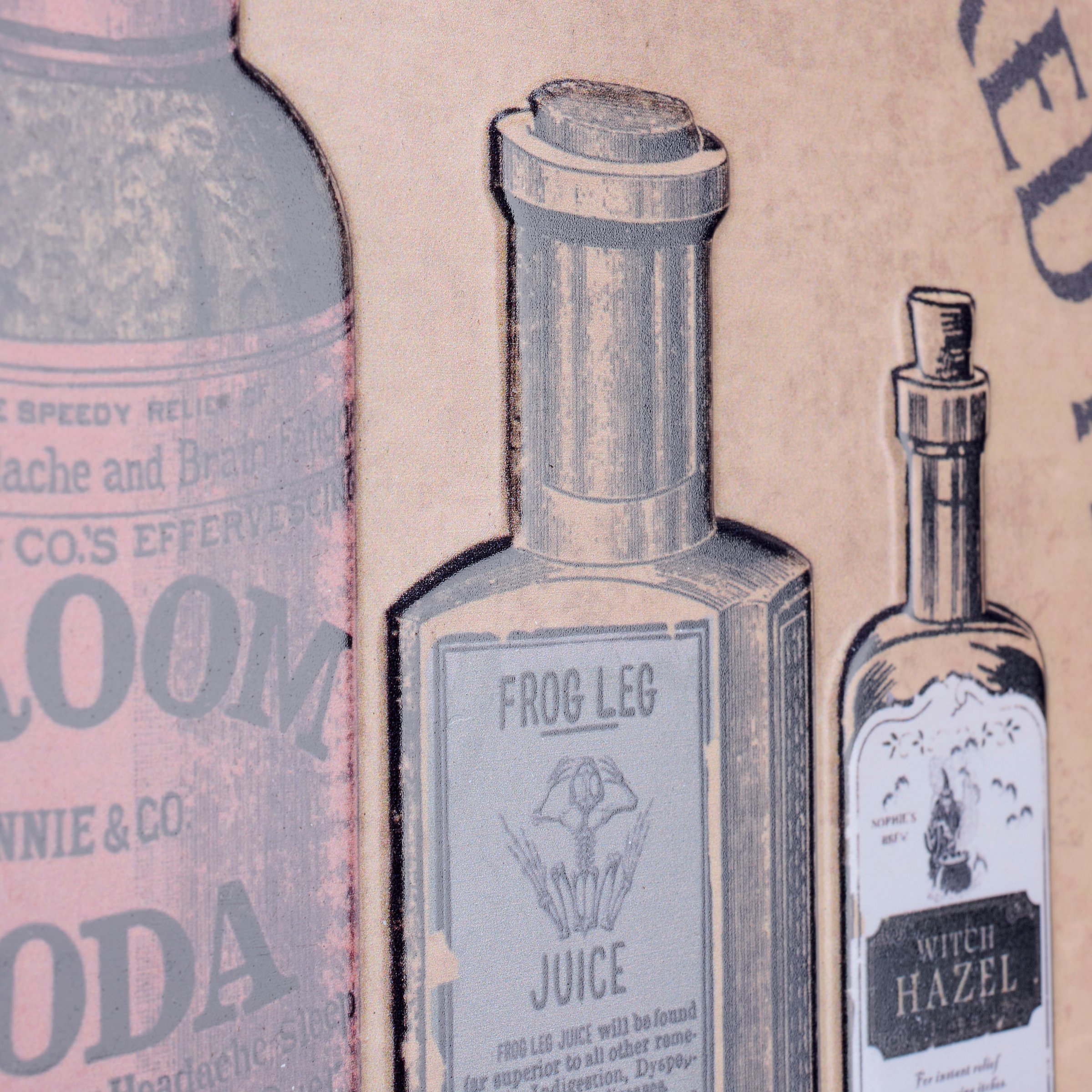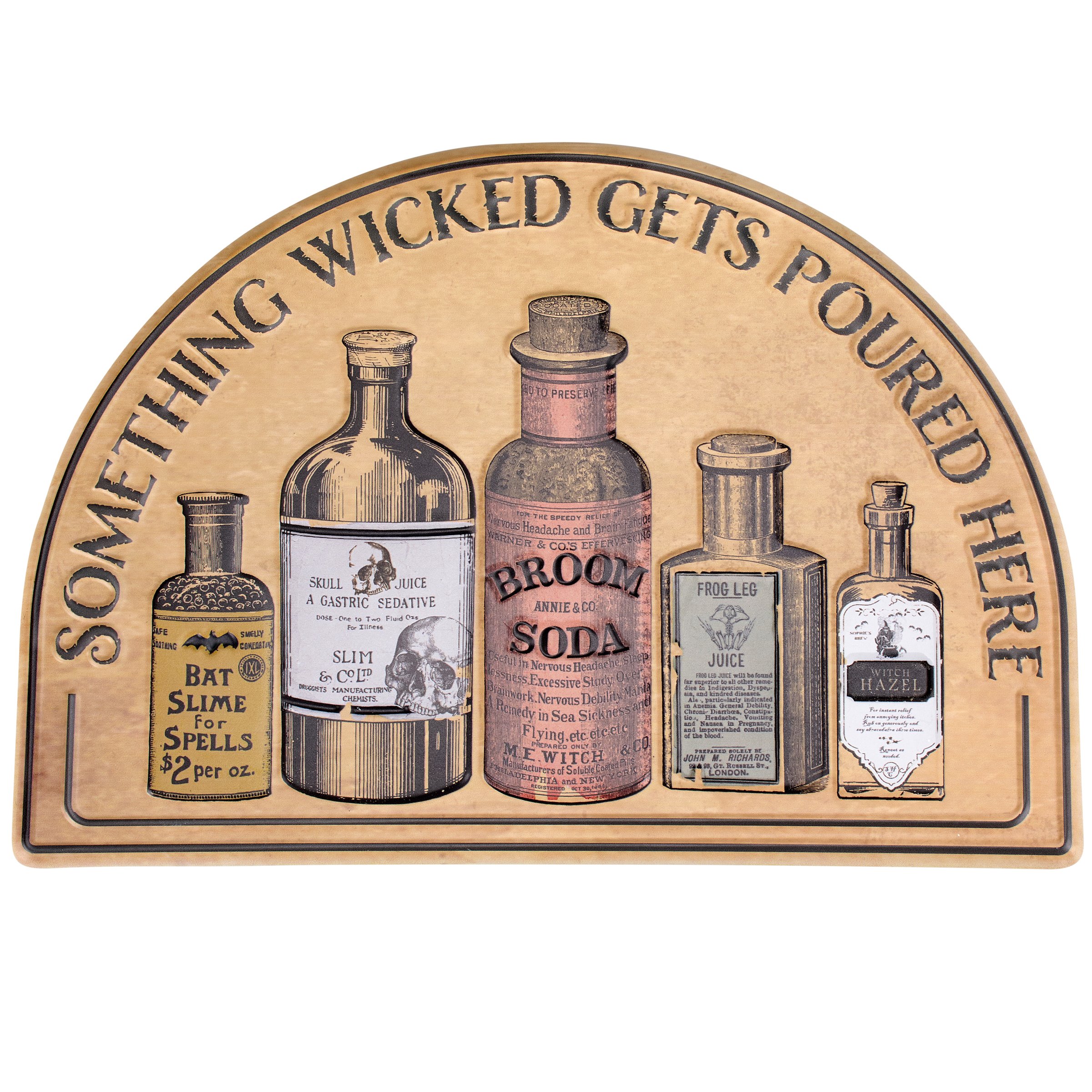 A metal wall décor piece from our Halloween Collection displaying rustic art of potion bottles and a fun witch inspired sentiment that reads "Something Wicked Gets Poured Here." Witchy sign features embossed details for added dimension. Our Something Wicked Gets Poured Here metal wall décor is ready to hang against wall via the attached sawtooth hanger on the back. A Halloween home accent perfect for seasonal displays or for everyday witch themed decor.