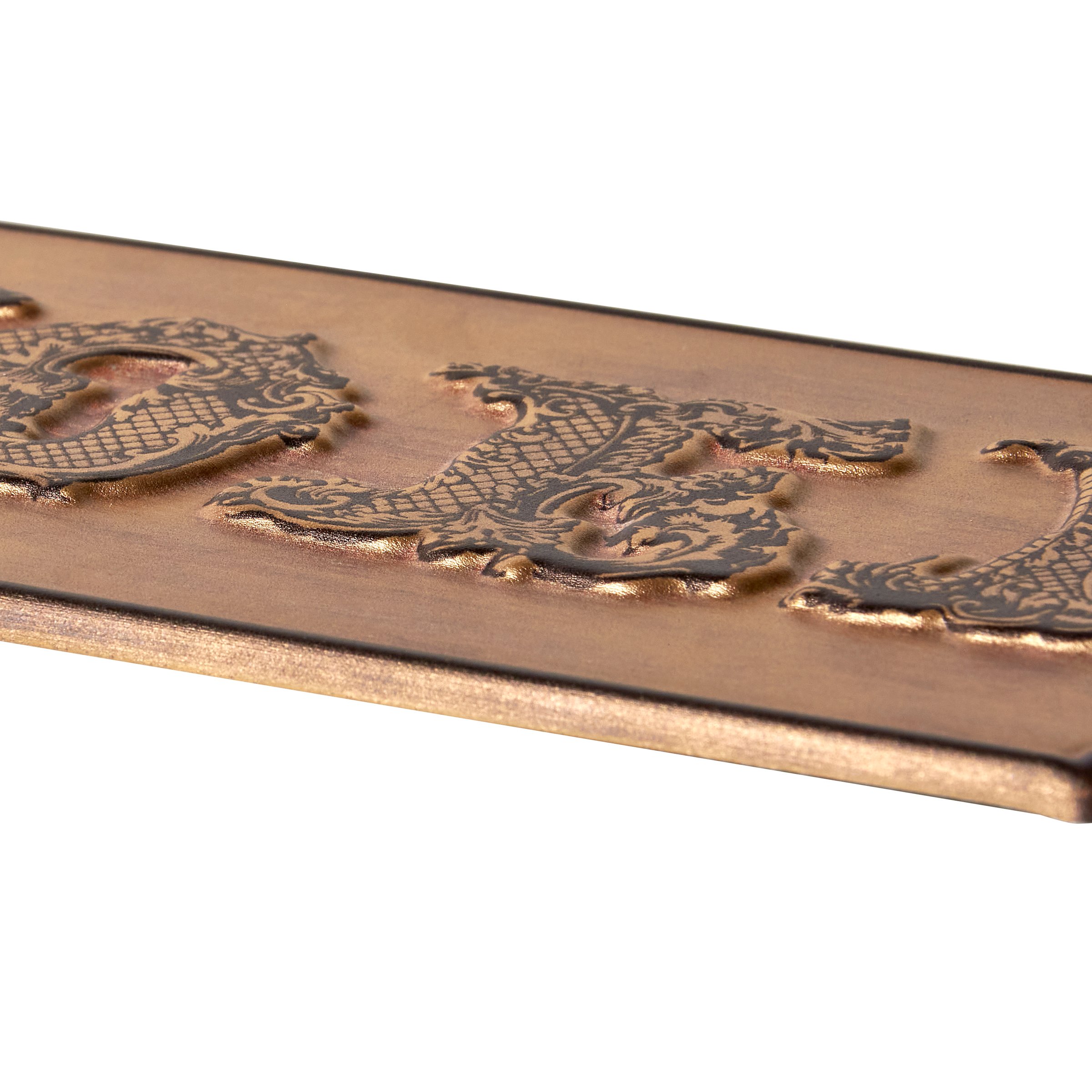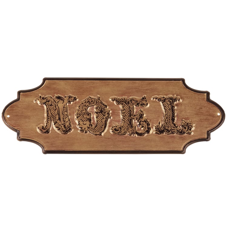 A metal wall décor piece from our Christmas Collection displaying a vintage inspired holiday design in gold and black with seasonal sentiment that reads "Noel." Design features embossed details as well as antique accents for an aged appearance. Our Noel wall décor is easy to hang against wall using the included nails and pre-drilled holes on each side. A vintage Christmas home accent perfect for seasonal display.