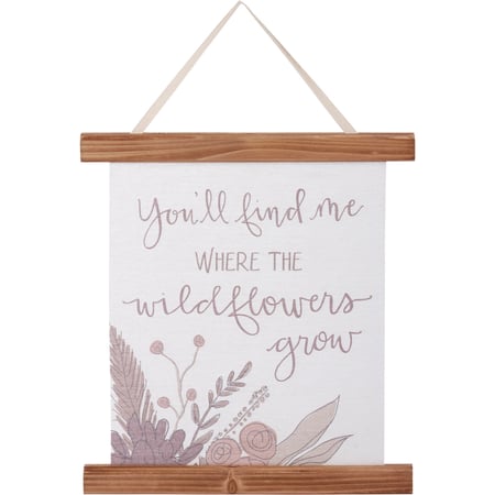 A canvas wall décor piece from our Cottagecore Collection displaying a comforting hand illustrated design of wildflowers. Sentiment reads "You'll Find Me Where The Wildflowers Grow." Canvas is pulled between two wooden slats. Our Where Wildflowers Grow wall décor hangs easily via cotton tape loop.