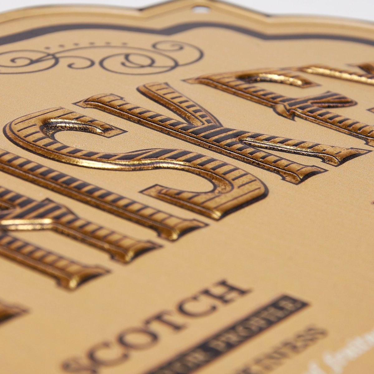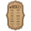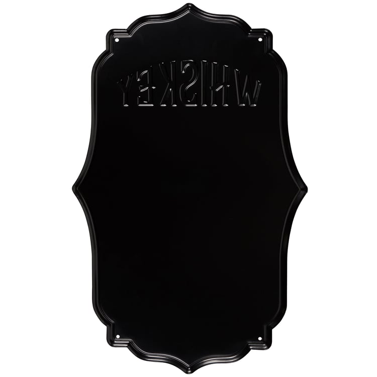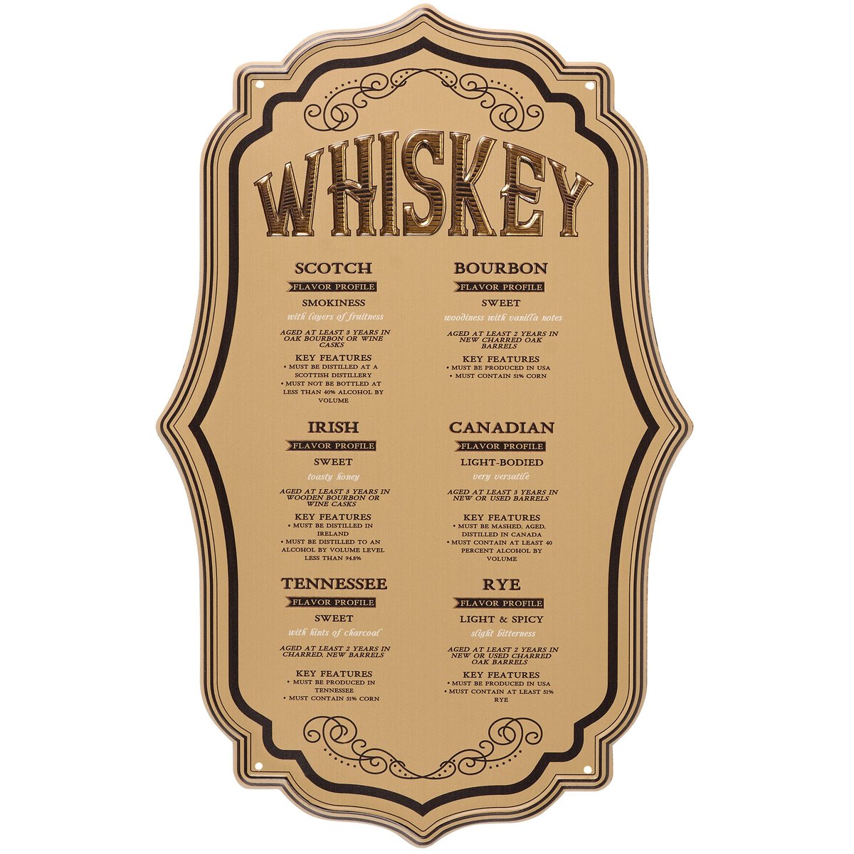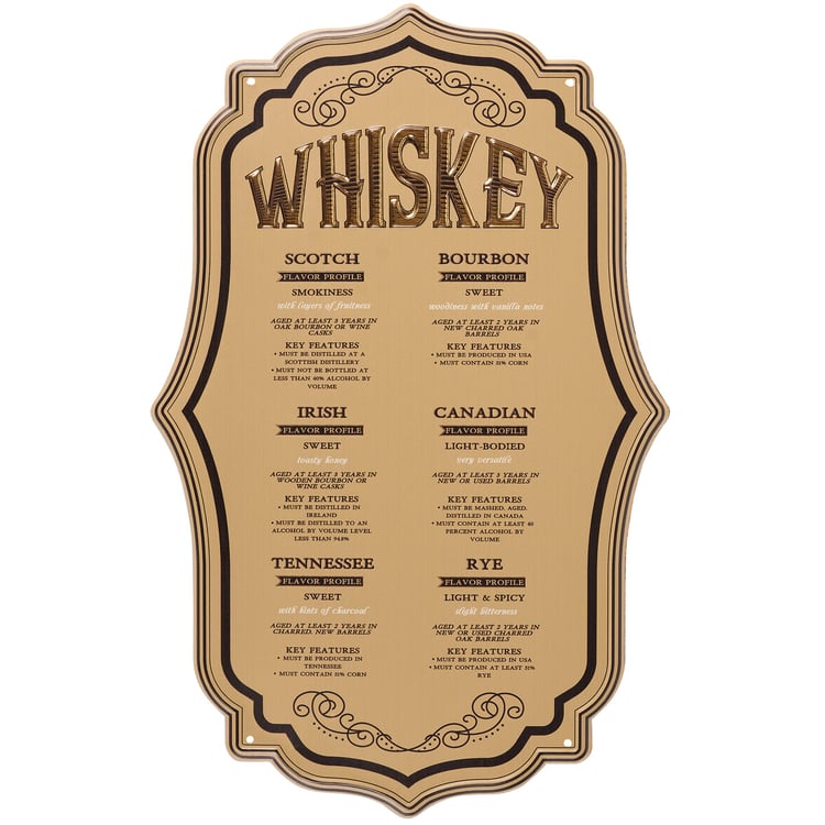 A metal wall décor piece from our Art Deco Collection displaying an art deco inspired design resembling a drink menu listing various types of whiskey with descriptions for each drink. Whiskey sign features embossed details and metallic gold accents. Our Whiskey metal wall décor is easy to hang against wall using the included mounting hardware and pre-drilled holes at the top and bottom. A vintage alcohol-themed home accent perfect for a home bar.