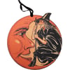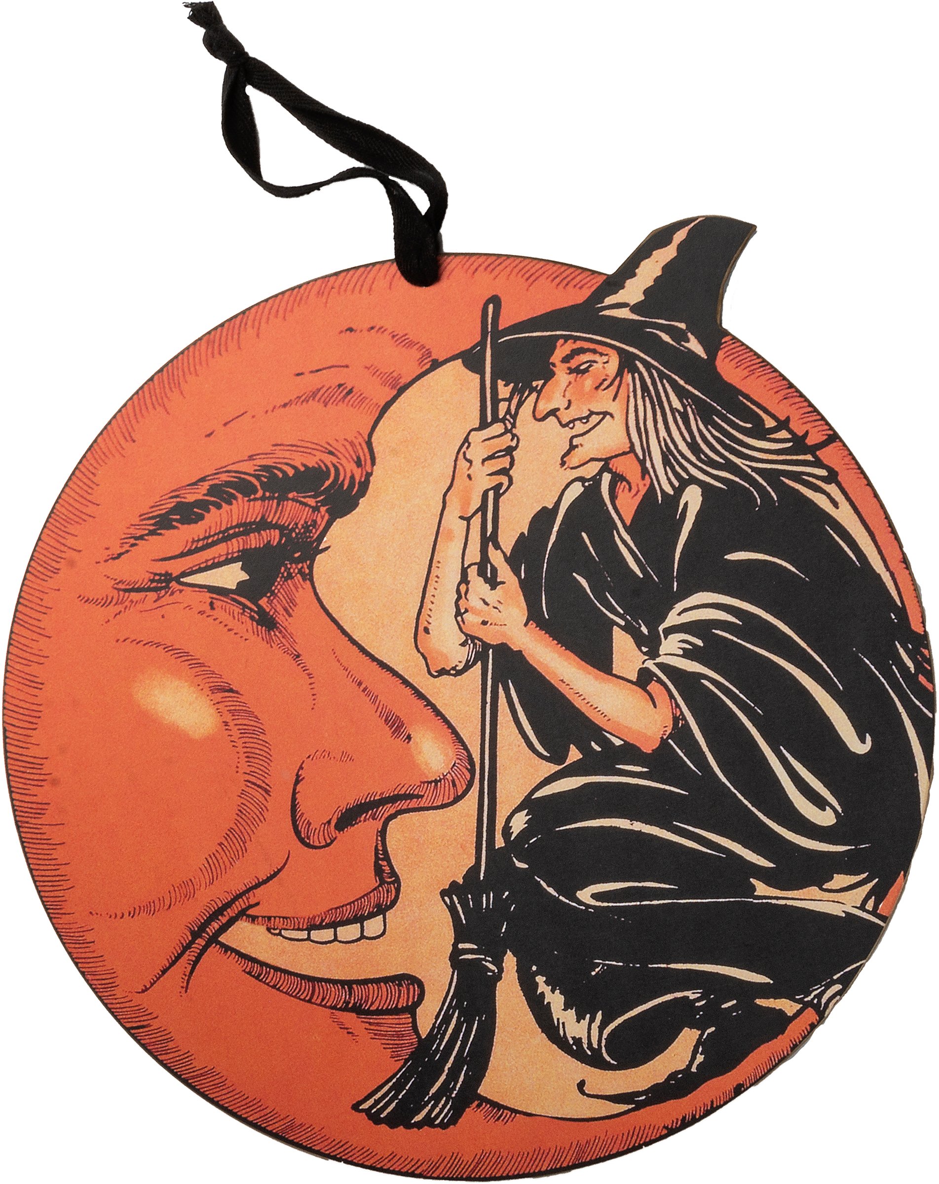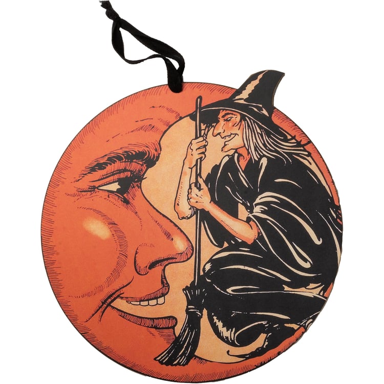 A vintage-inspired wall décor piece from our Halloween Collection featuring witch and moon illustrations, a muted black and orange palette, and includes black cotton tape loop for easy hanging. pur Witch moon wall decor complements well with other pieces in collection or existing decor.