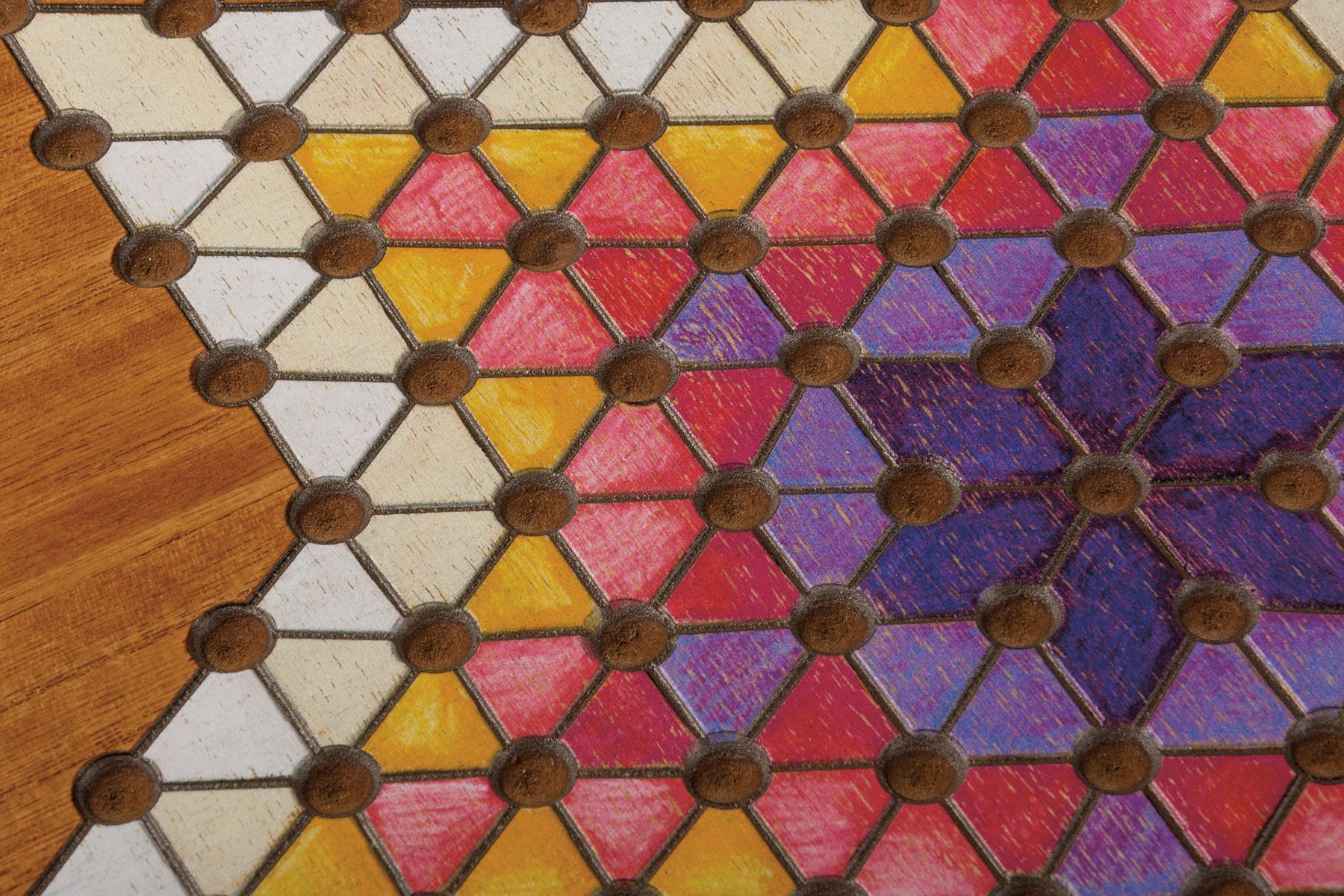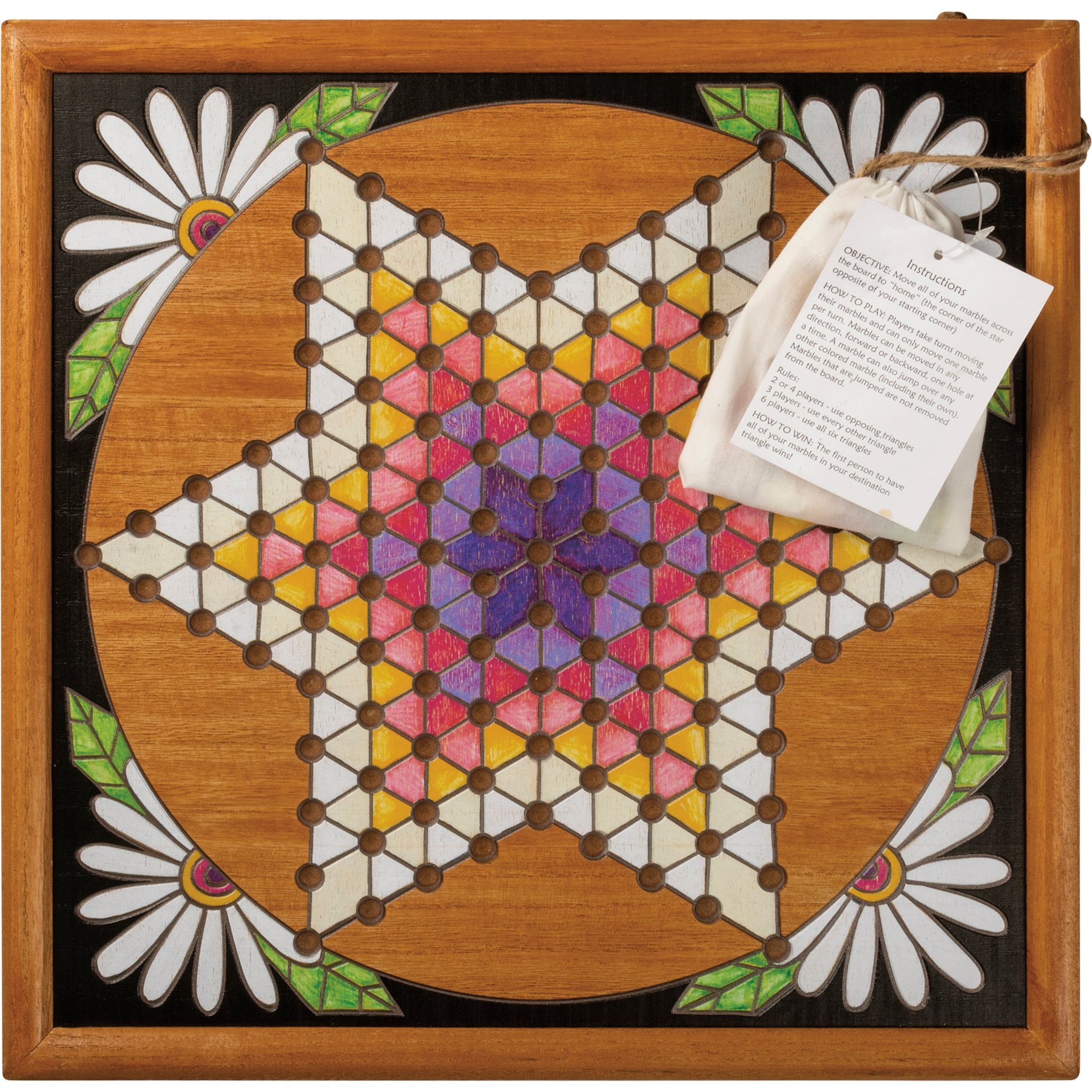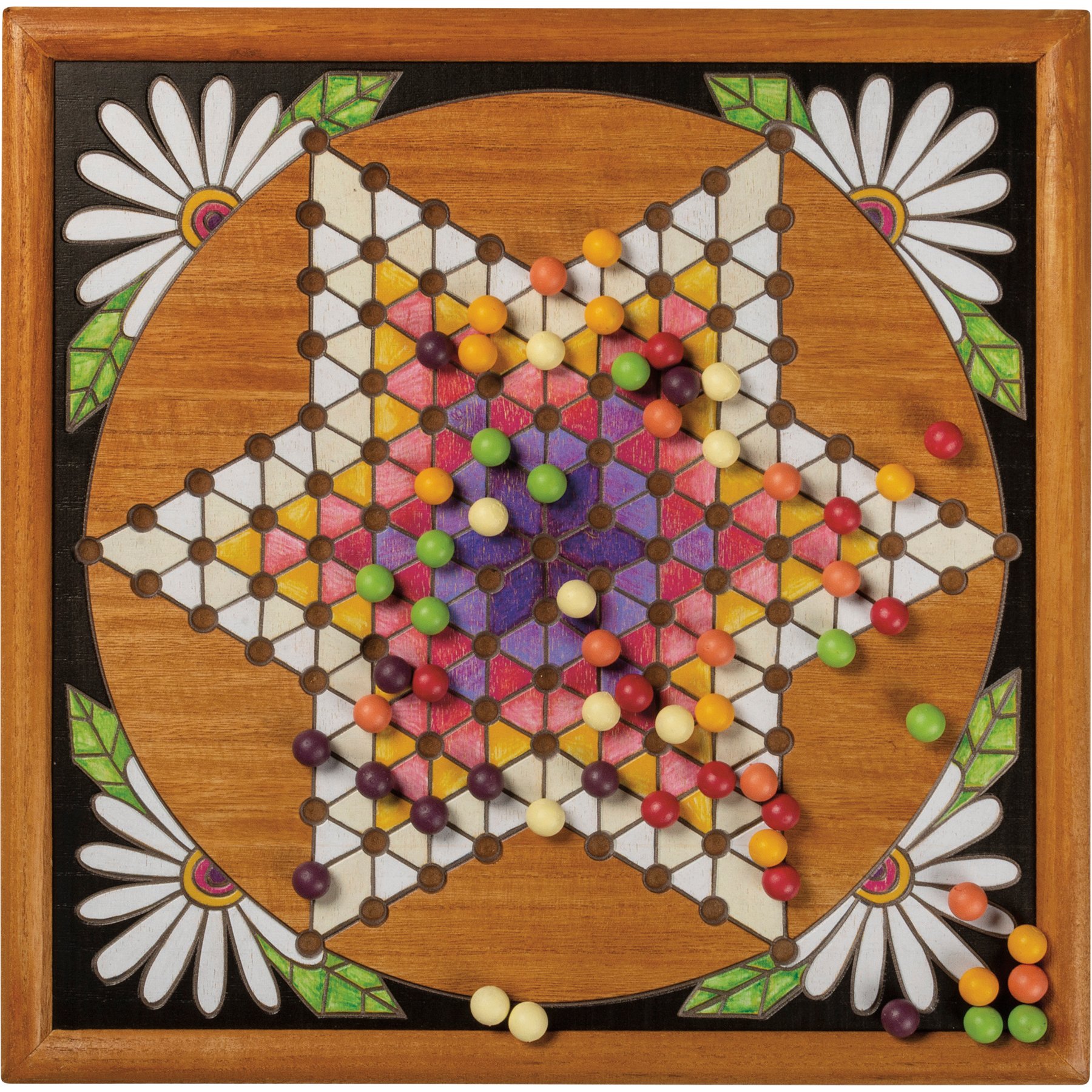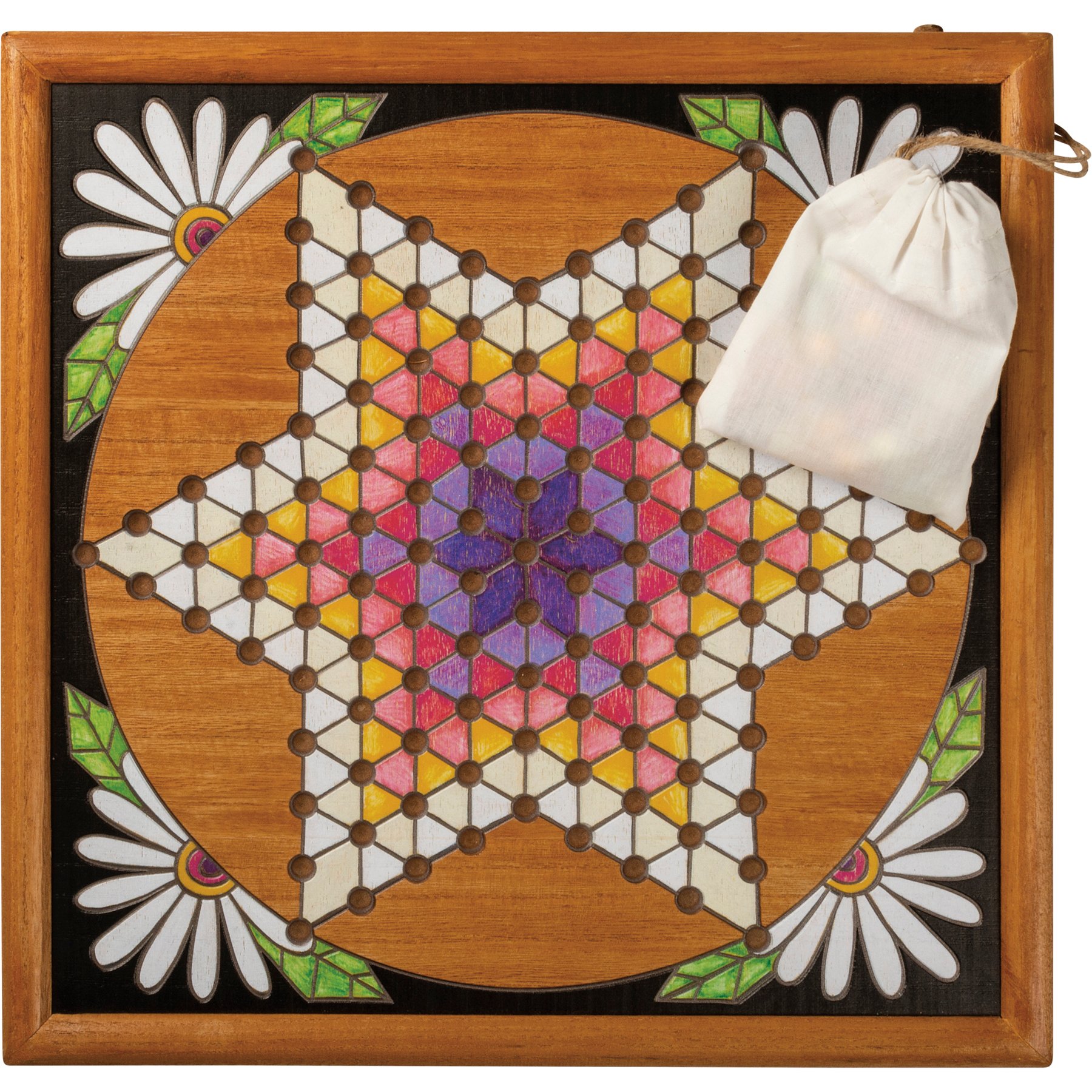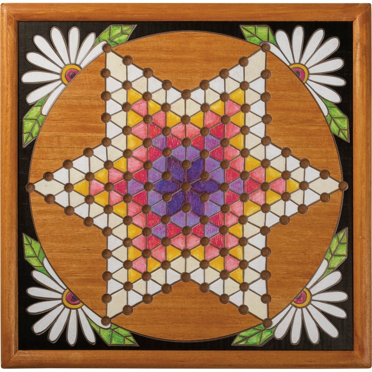 A wooden Chinese Checkers game featuring intricate, vibrantly colored wood burned designs. Includes 60 marbles (6 different colors) that can be stored inside the included drawstring bag. Also includes an instruction sheet. Game boards double as beautiful conversation pieces and wall decor as well. Hang via predrilled keyholes. Not eligible for further discounting.