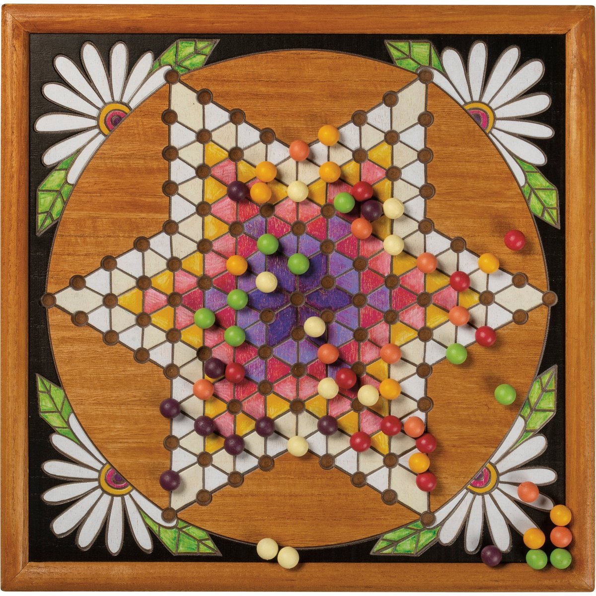 A wooden Chinese Checkers game featuring intricate, vibrantly colored wood burned designs. Includes 60 marbles (6 different colors) that can be stored inside the included drawstring bag. Also includes an instruction sheet. Game boards double as beautiful conversation pieces and wall decor as well. Hang via predrilled keyholes. Not eligible for further discounting.