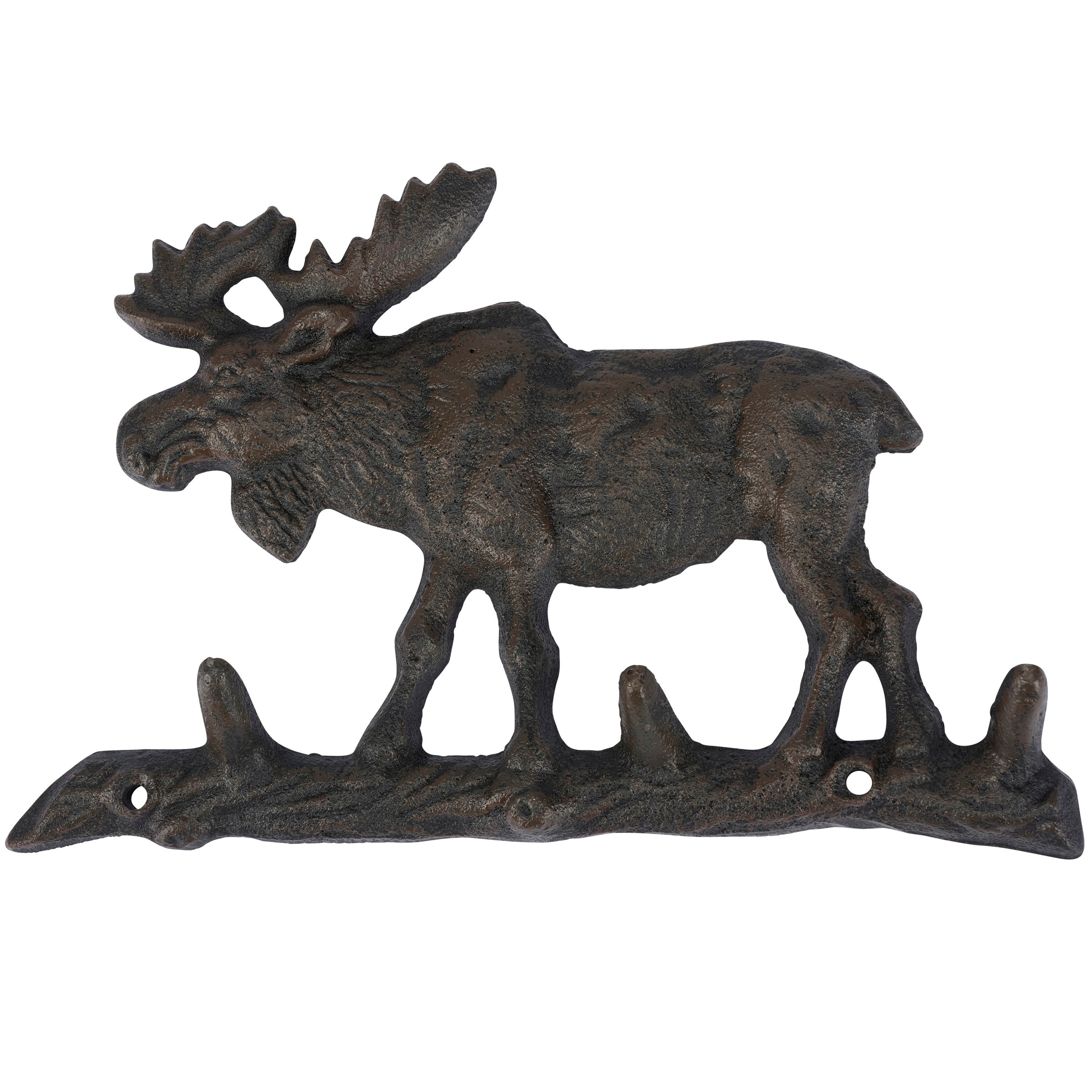A metal wall hook from our Lake & Cabin Collection displaying a rustic design inspired by cabin décor. This sturdy wall hook features a sculpted design of a moose on a log with antique finish and three angled tree branches to create hooks for hanging accessories or clothing on the wall. Our Bull Moose wall hook is easy to hang for display and use via predrilled holes. A rustic home accent that adds functional style to any space.