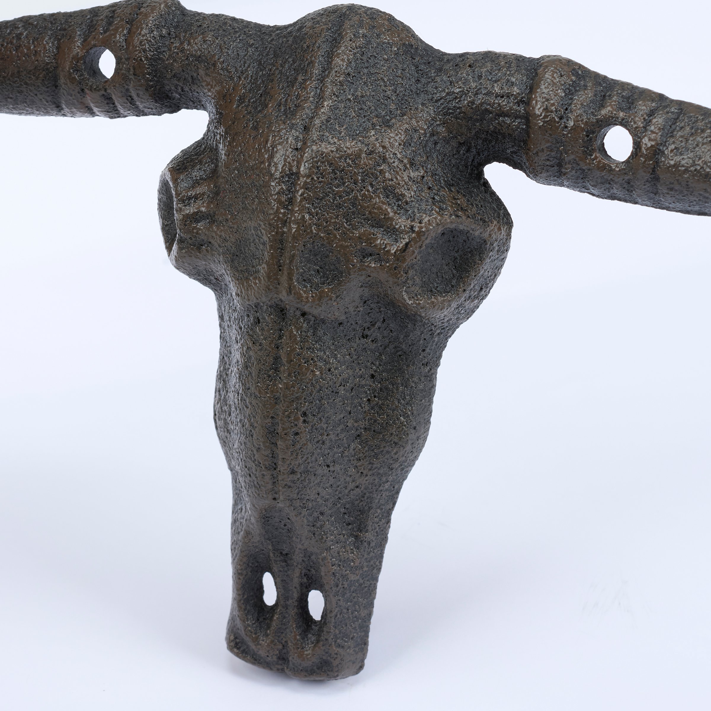 A metal wall hook from our Western Collection featuring a sculpted bull skull design with antique finish and angled horns to create two hooks for hanging accessories or clothing on the wall. Our Bull Skull wall hook is easy to hang for display and use via predrilled holes. A western home accent that adds functional style to any space.
