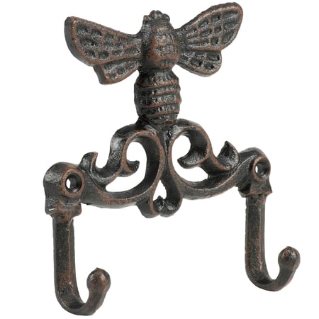 A decorative wall hook from our Garden Collection featuring a sculpted bumblebee attached to 2 metal hooks for hanging accessories on a wall. Bumblebee wall hook features distressed details for an aged appearance. Our Bumblebee wall hook is easy to hang against wall via predrilled holes. A vintage bee-themed home accent perfect for everyday display.