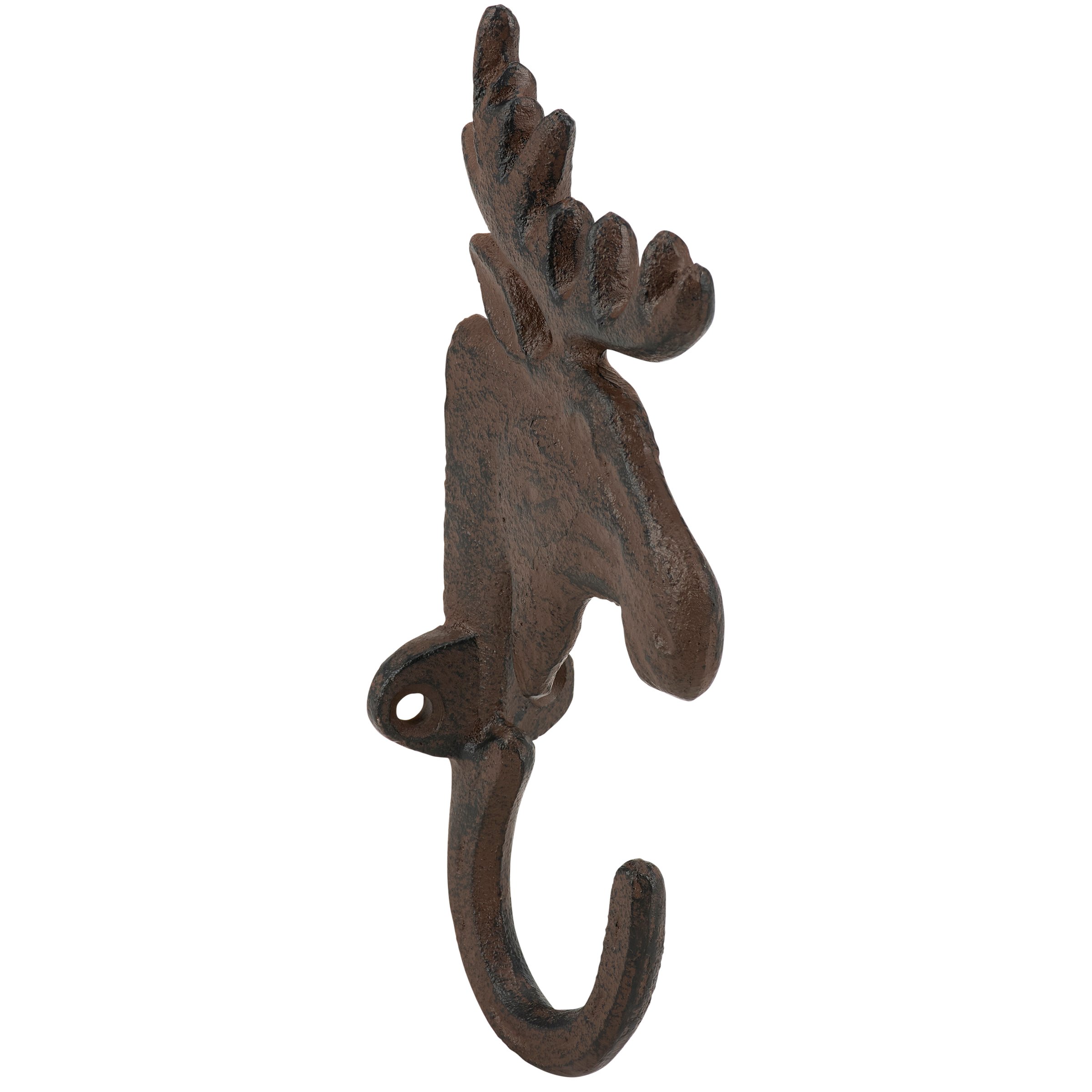 A metal wall hook from our Lake & Cabin Collection displaying a rustic design inspired by cabin décor. This sturdy wall hook features a sculpted moose head design with rust finish and a hook attached at the bottom for hanging accessories or clothing on the wall. Our Moose Head wall hook is easy to hang for display and use via predrilled holes. A rustic home accent that adds functional style to any space.