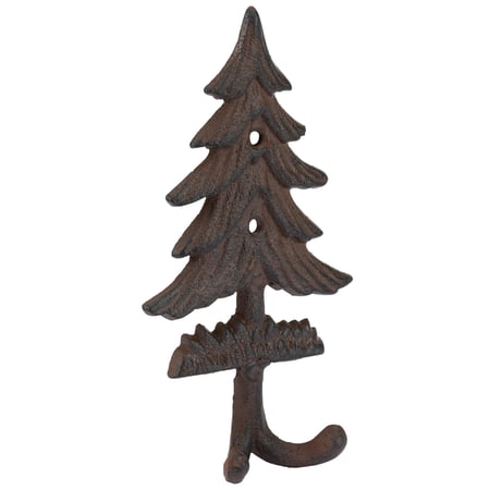 A metal wall hook from our Lake & Cabin Collection displaying a rustic design inspired by cabin décor. This sturdy wall hook features a sculpted pine tree design with rust finish and two hooks attached at the bottom for hanging accessories or clothing on the wall. Our Pine Tree wall hook is easy to hang for display and use via predrilled holes. A rustic home accent that adds functional style to any space.