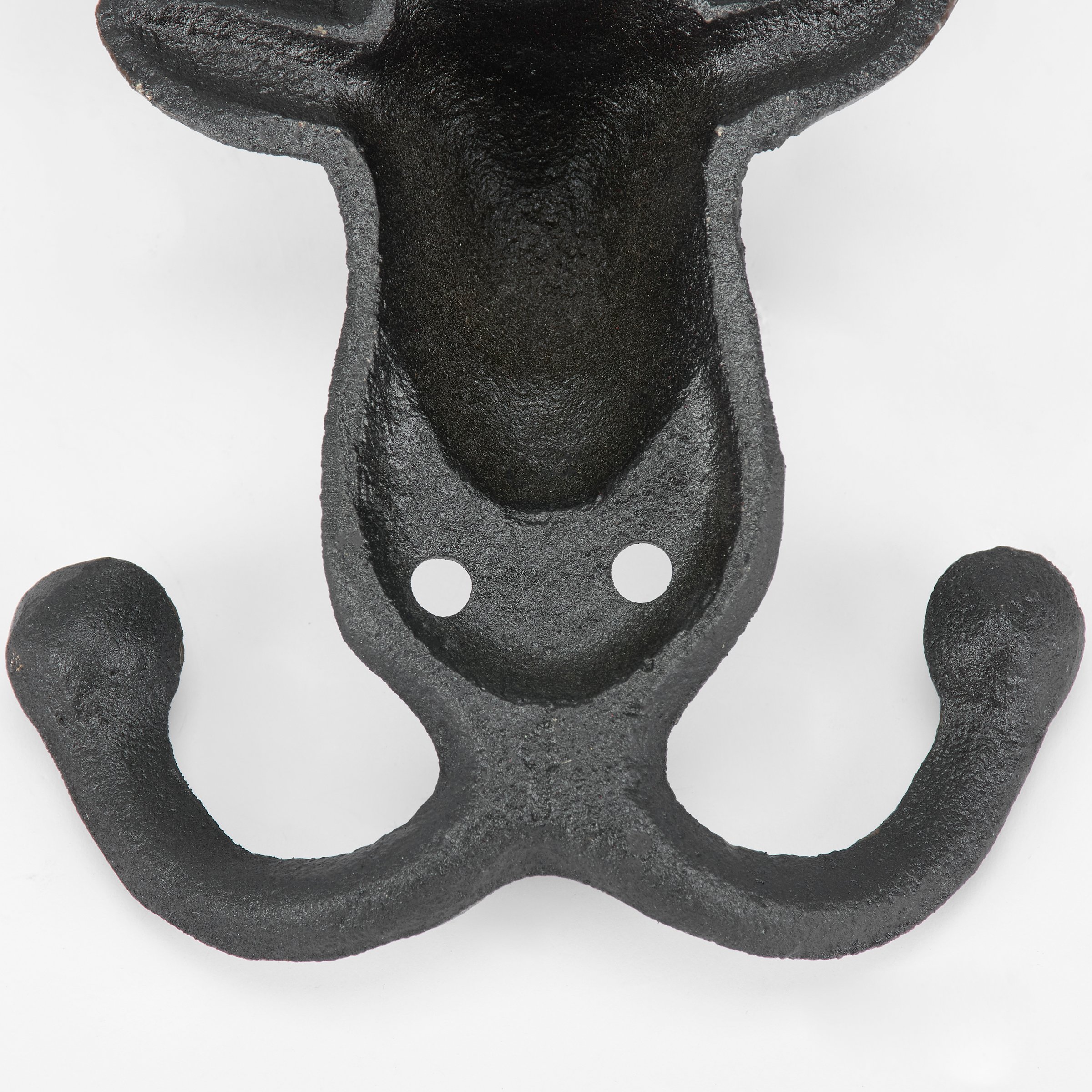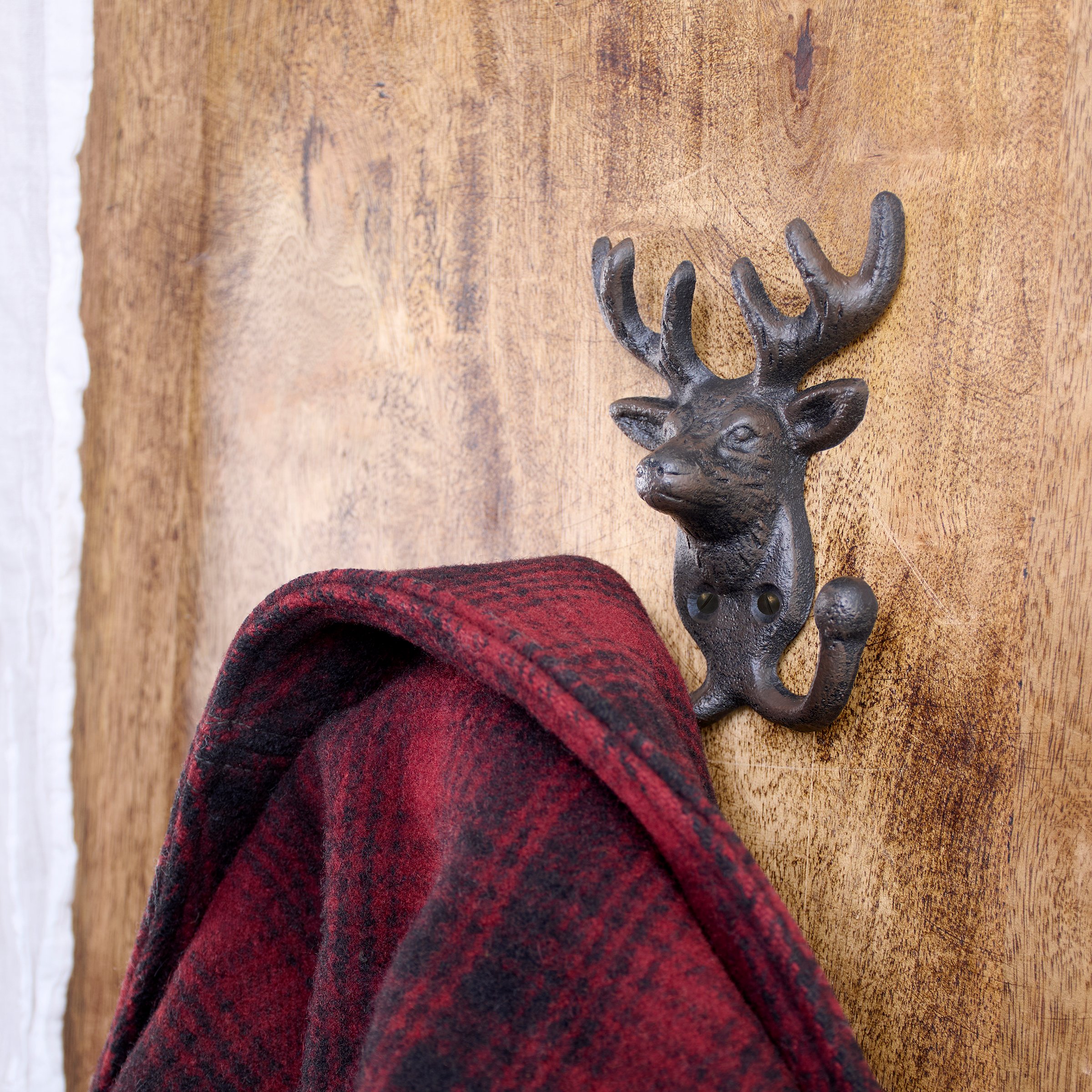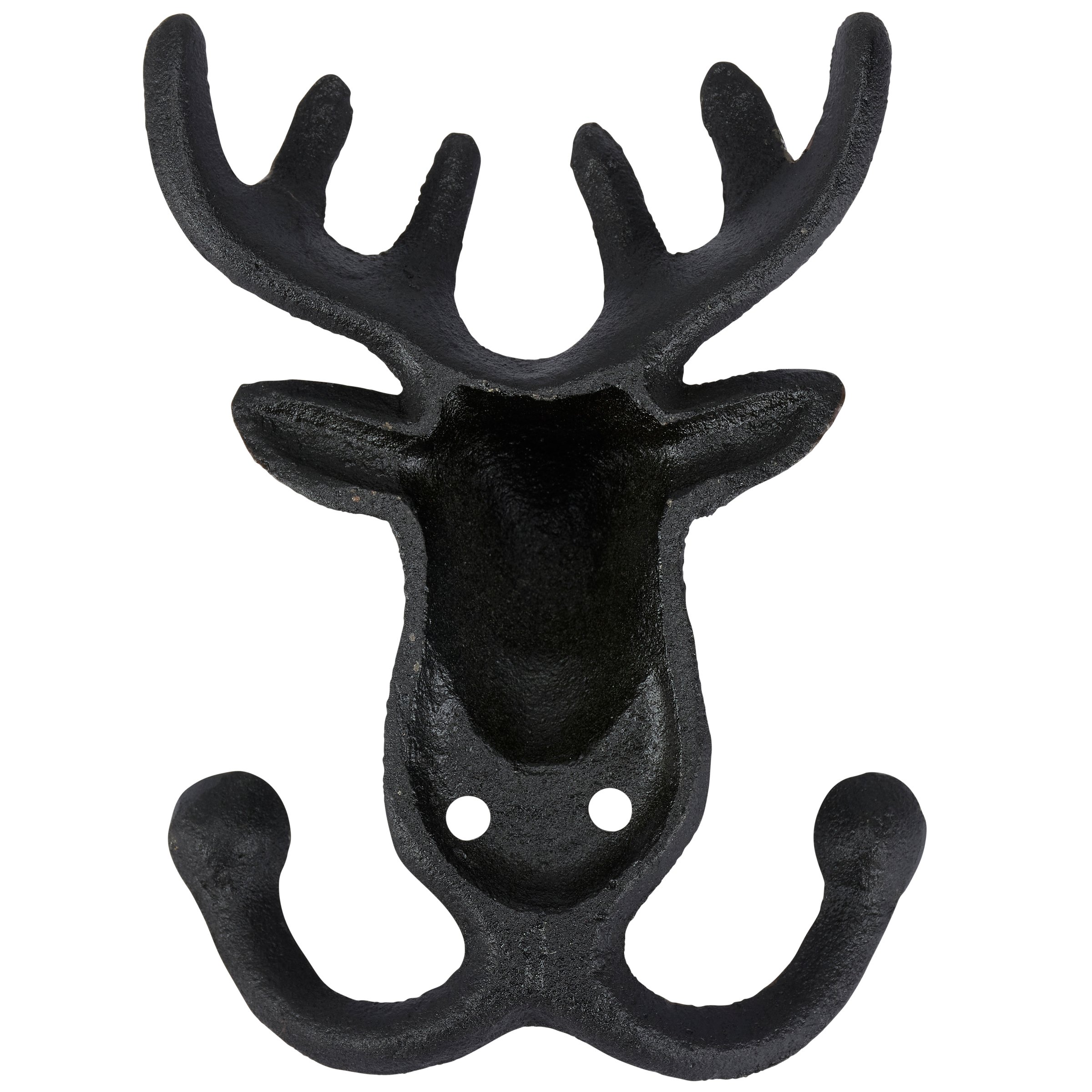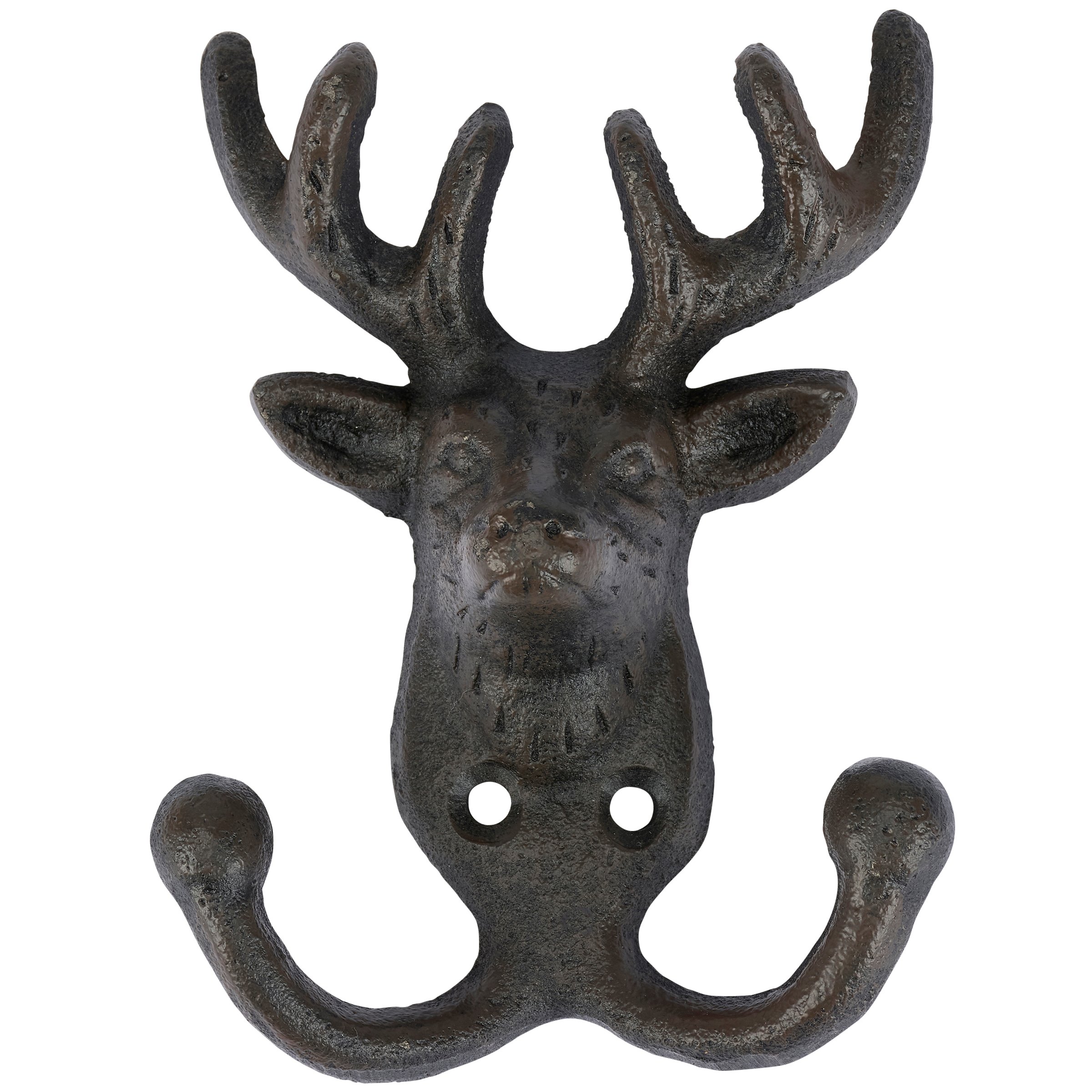A metal wall hook from our Lake & Cabin Collection displaying a rustic design inspired by cabin décor. This sturdy wall hook features a sculpted stag head design with rust finish and two hooks attached at the bottom for hanging accessories or clothing on the wall. Our Stag Head wall hook is easy to hang for display and use via predrilled holes. A rustic home accent that adds functional style to any space.