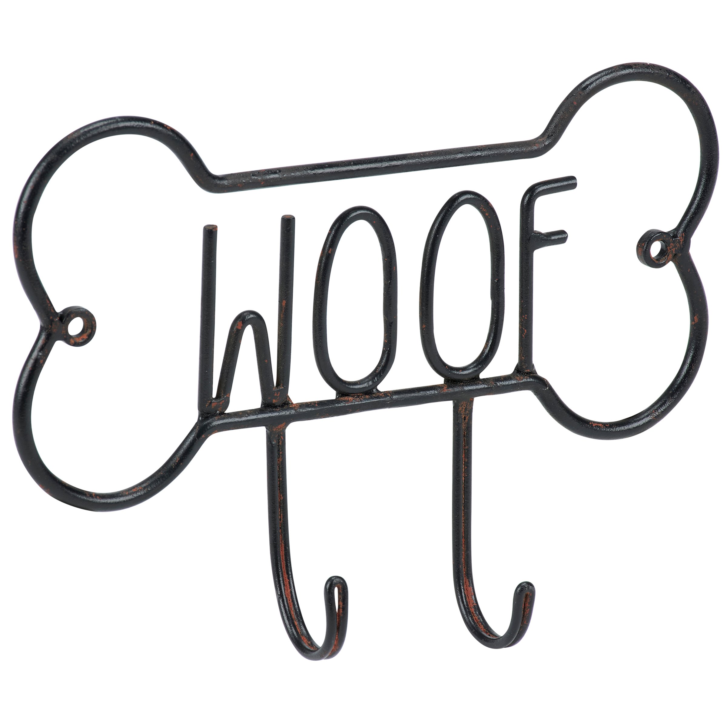 A metal wall hook from our Pet Collection featuring a dog bone outline and "Woof" sentiment with two sturdy hooks attached at the bottom for hanging pet accessories or clothing on the wall. Our Woof wall hook is easy to hang for display and use via predrilled holes. A rustic dog themed home accent that adds functional style to any space while showing off a love for pets.