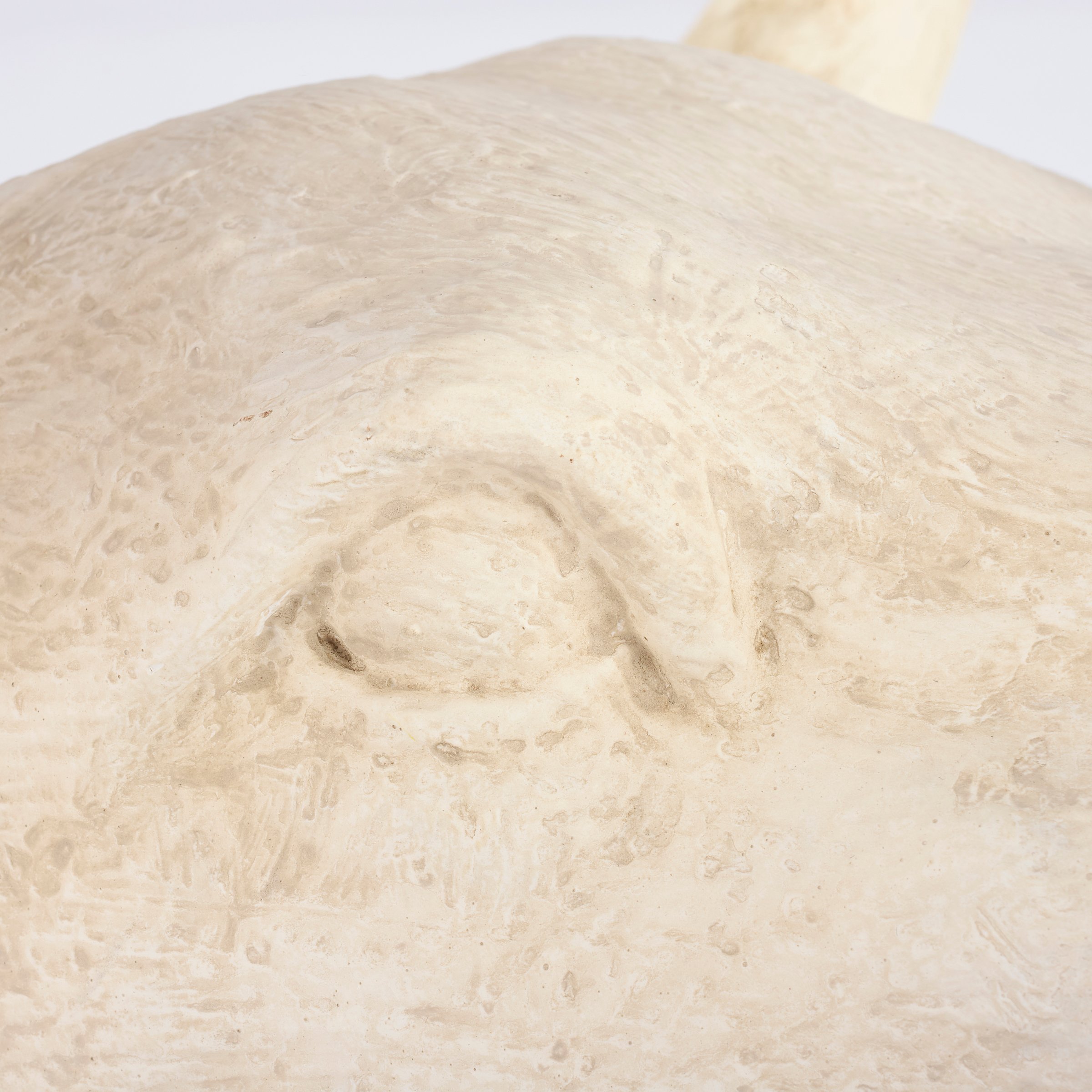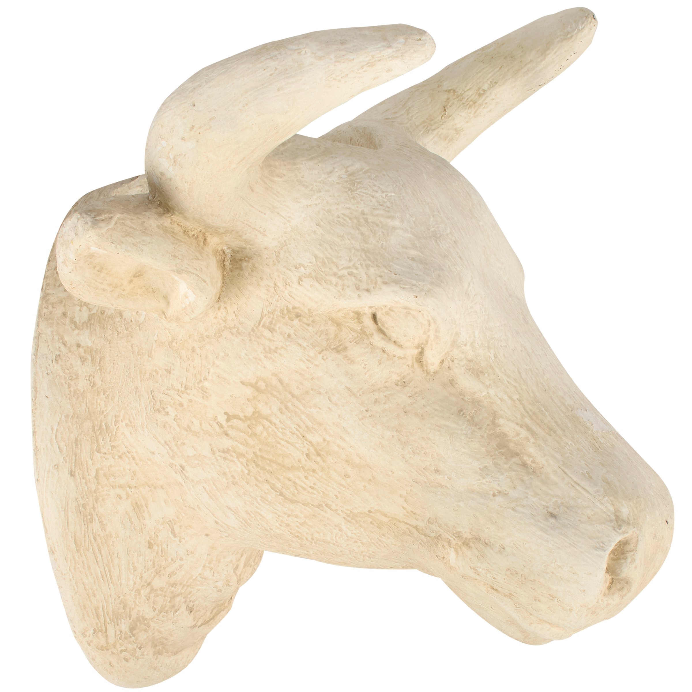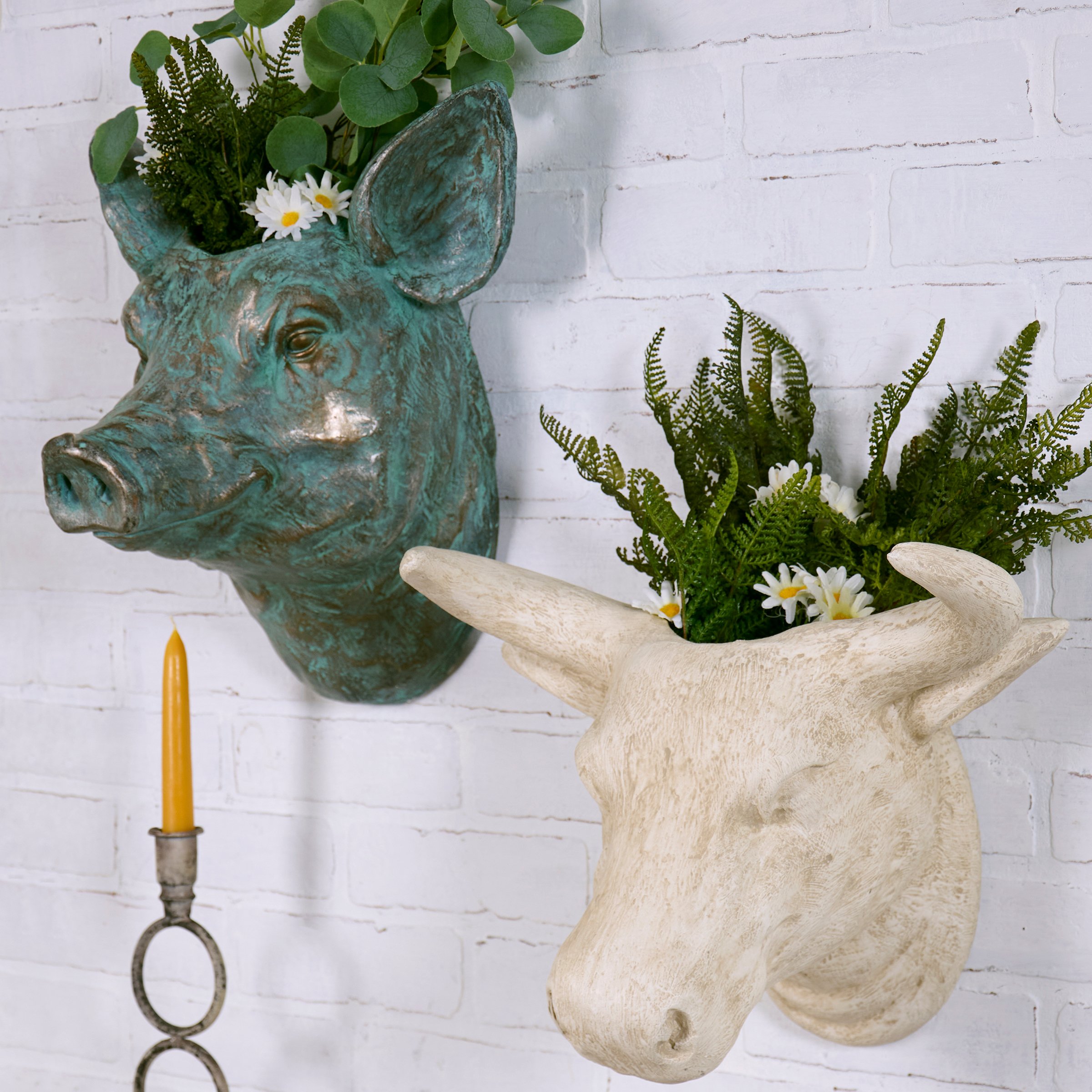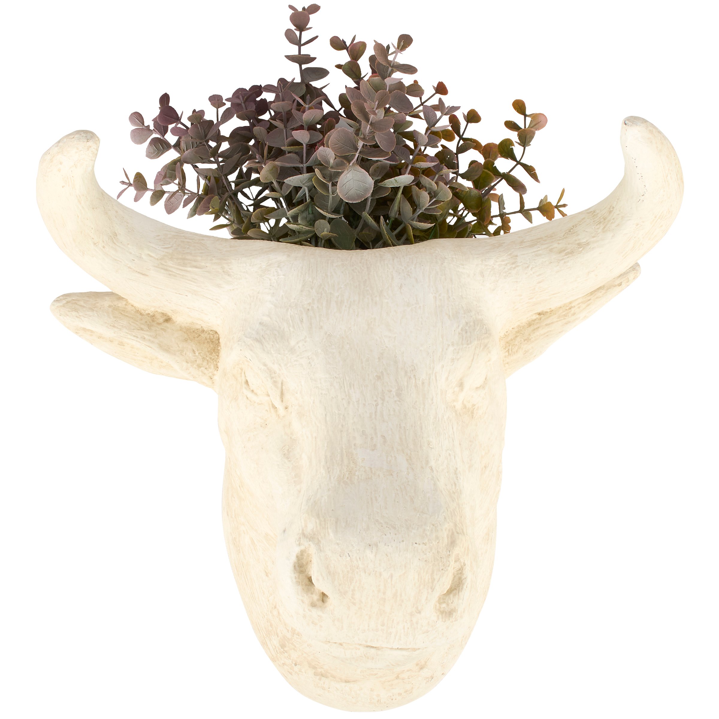 A cement wall planter from our Cottage Charm Collection displaying a sculpted steer head design with cream finish and distressed details for aged appearance. Steer planter features a flat back to hang against wall and a hole on the top to place greenery or décor. Greenery pictured not included. Our Steer wall planter is ready to hang for display via metal keyhole slots on the back. A farm themed plant accessory perfect for adding vintage style to plant displays.