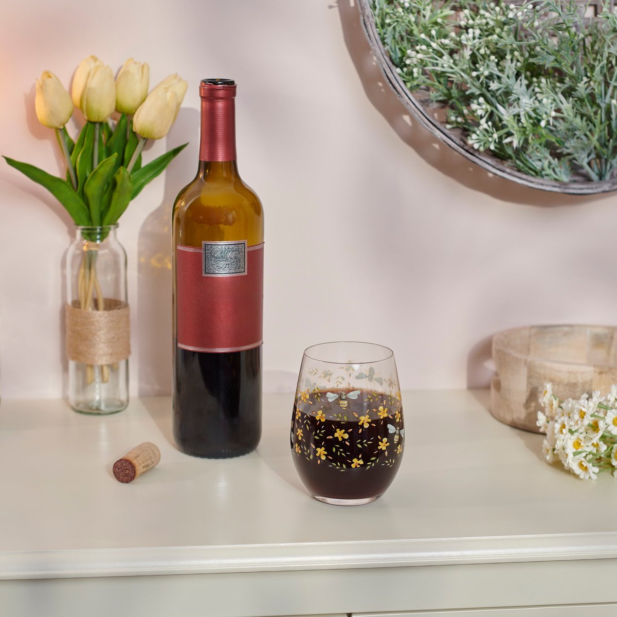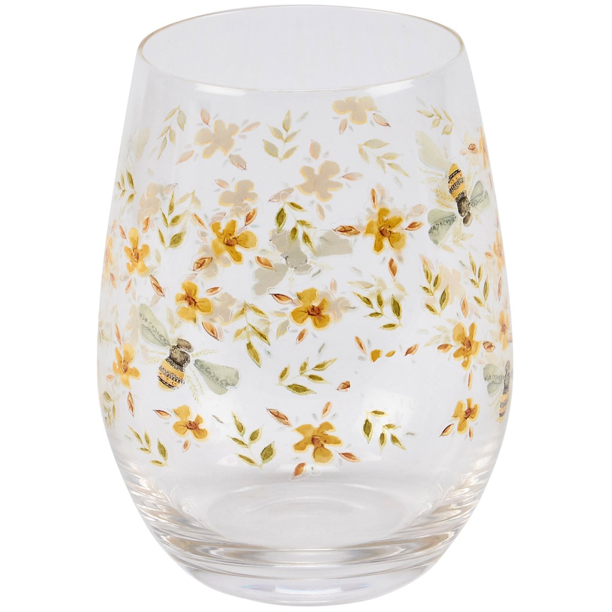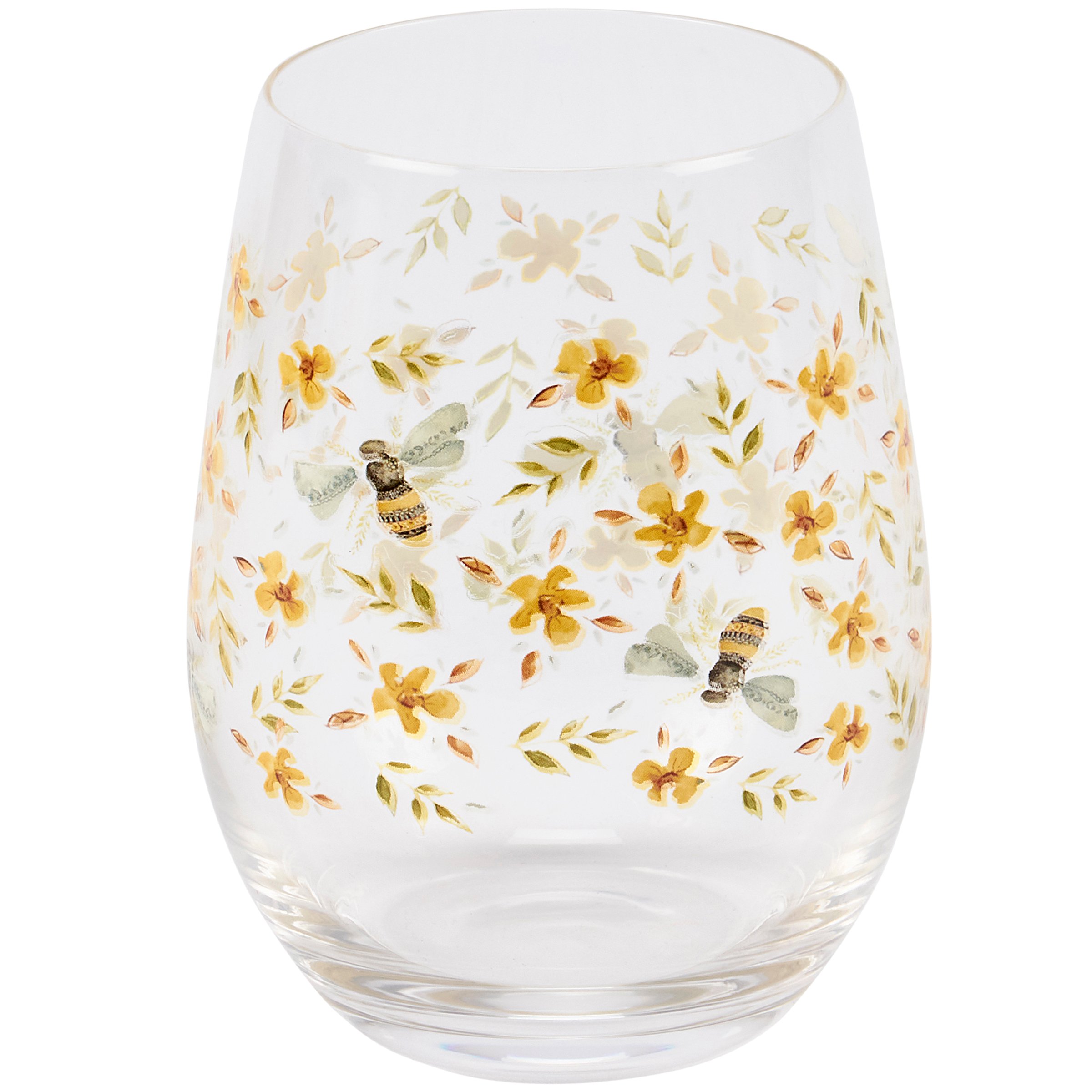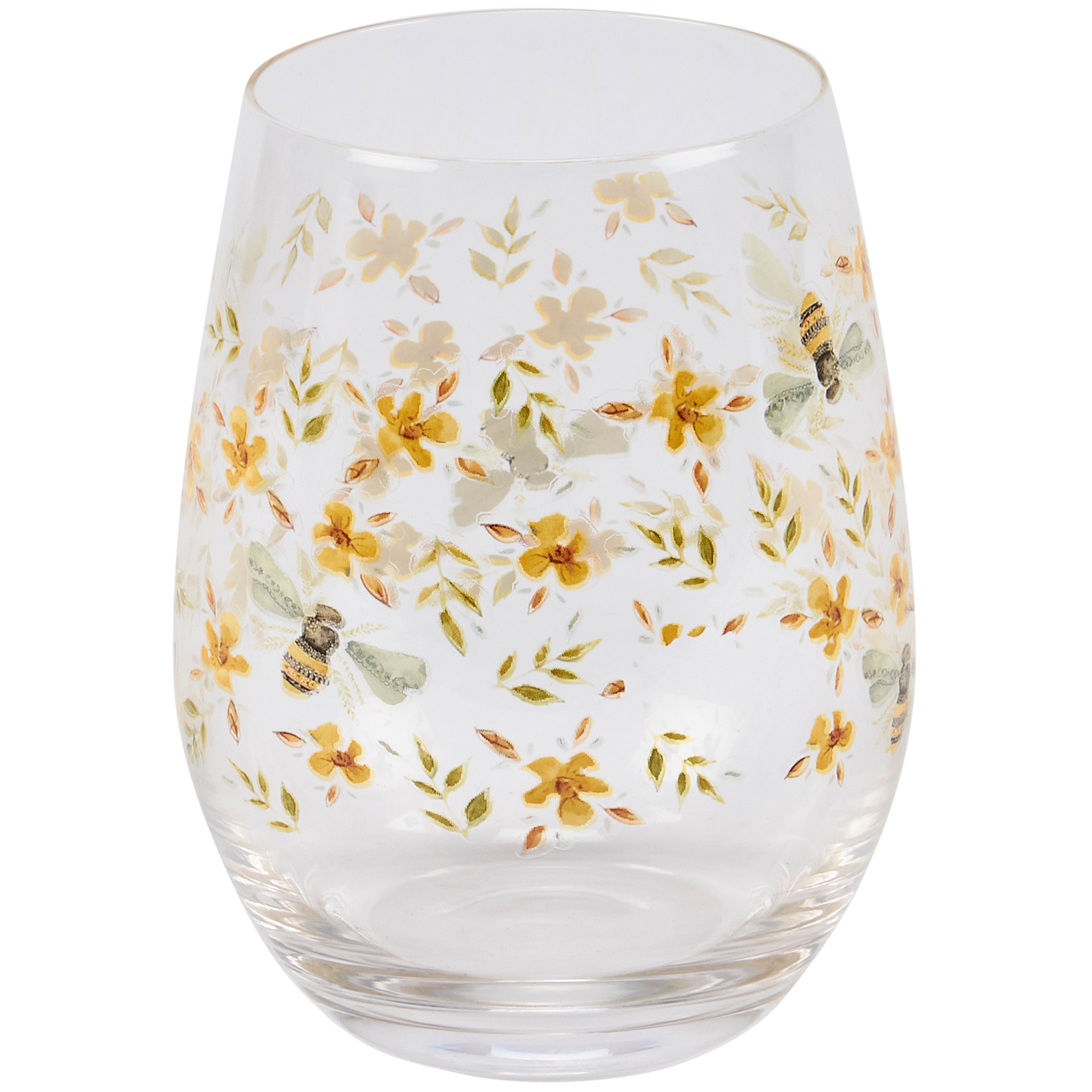 A 15 oz stemless wine glass from our Garden Collection displaying a full color wrap-around design of bees and yellow flowers replicated from original hand painted art. Our Bee wine glass comes packaged in a high-quality giftable cylinder box showcasing design in full color. Hand-wash only. A charming drinkware option that is also great for gifting.