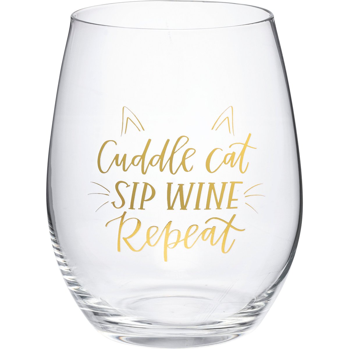 A 15 oz stemless wine glass displaying a fun cat inspired sentiment in metallic gold that reads "Cuddle Cat - Sip Wine - Repeat" with coordinating illustrations. Our Cuddle Cat Sip Wine glass comes packaged in a high-quality cylinder box displaying full design. Hand-wash only. A fun pet-themed piece of drinkware that is also great for gifting.
