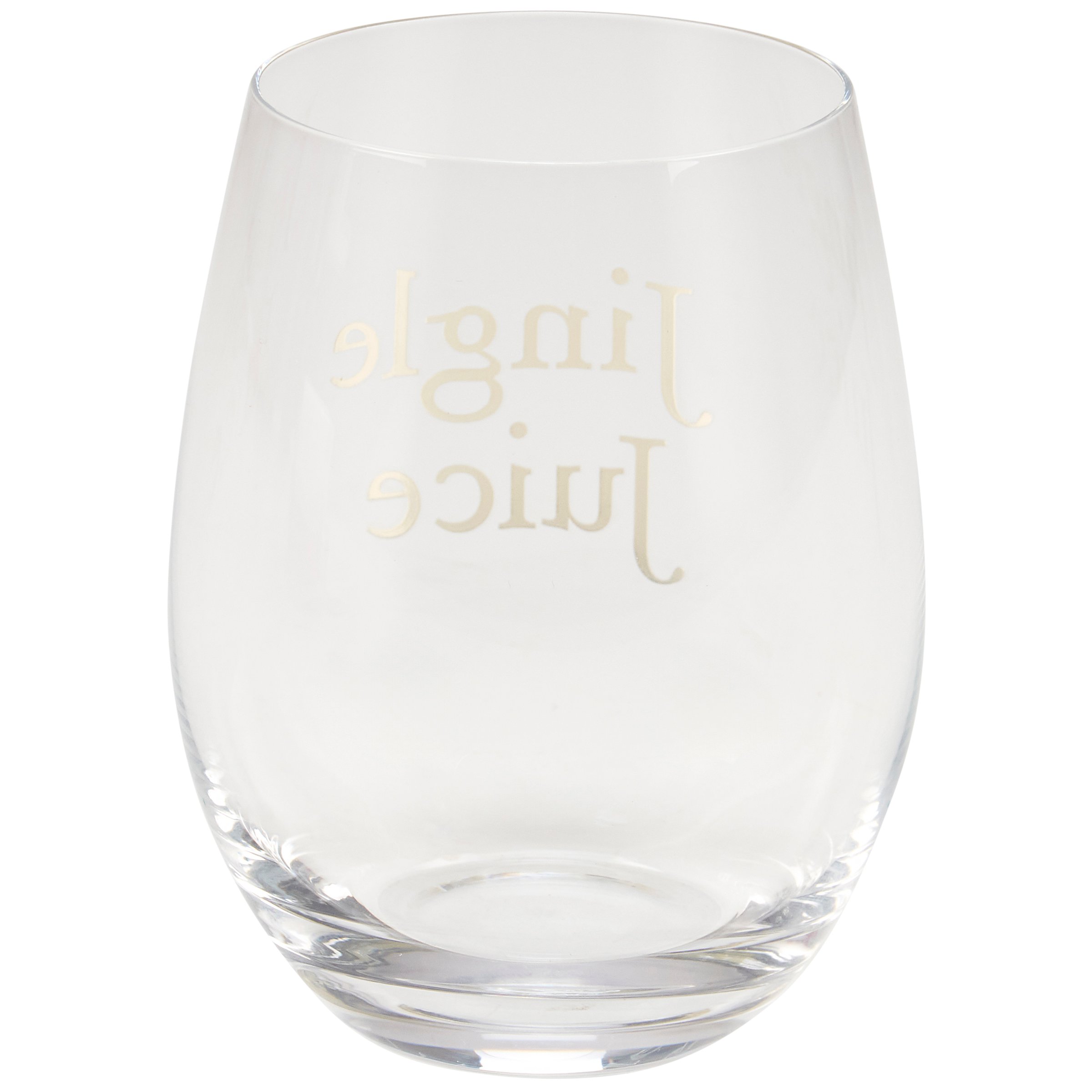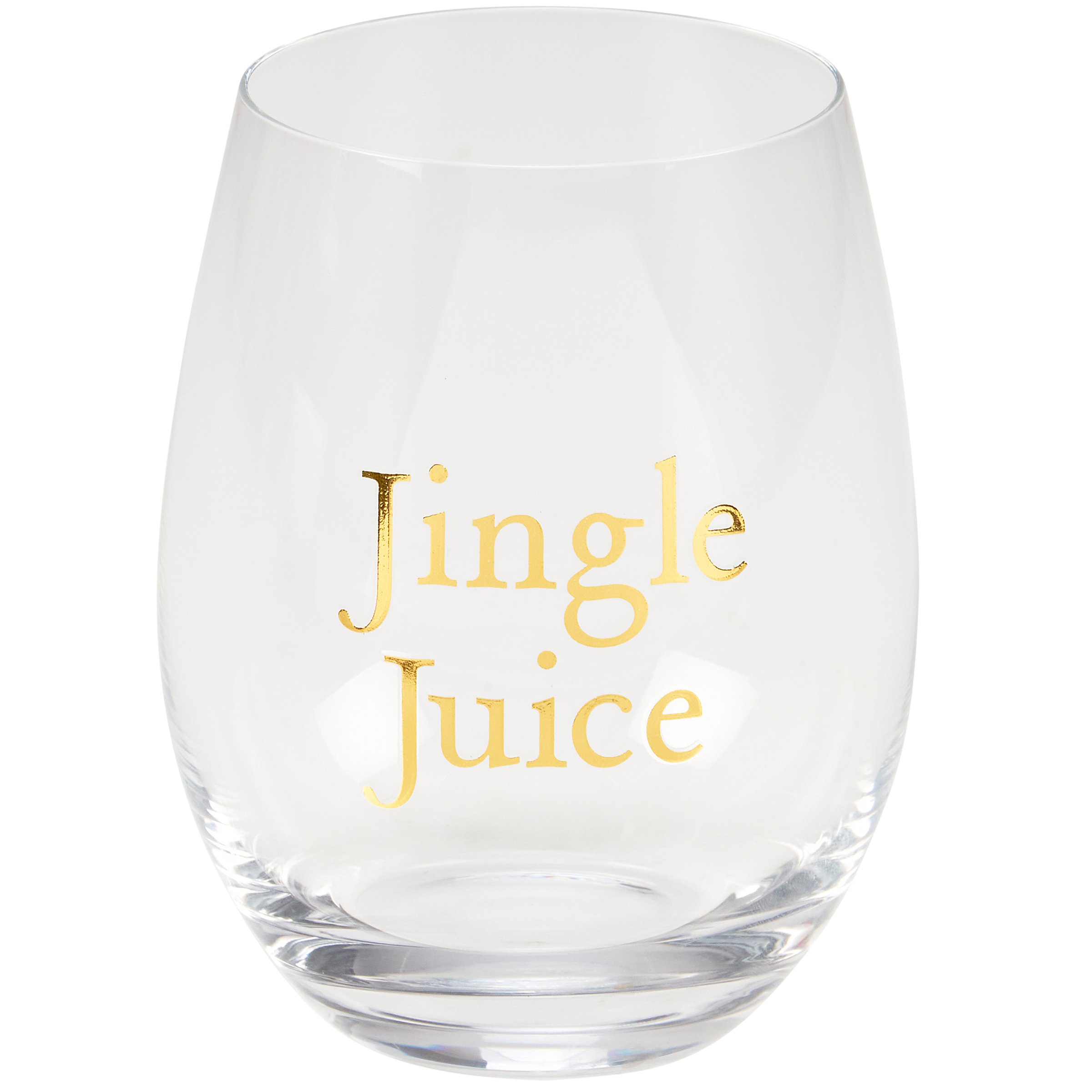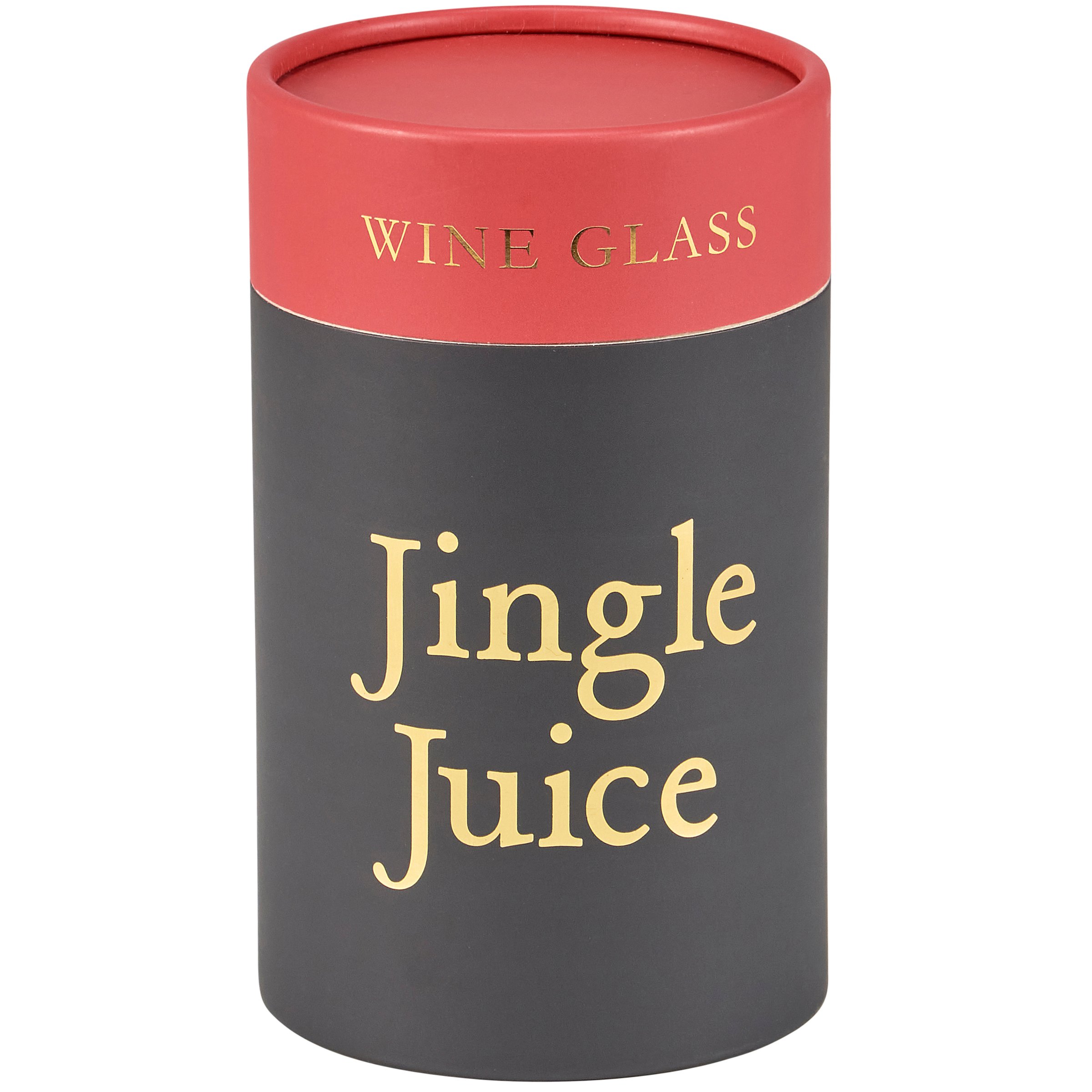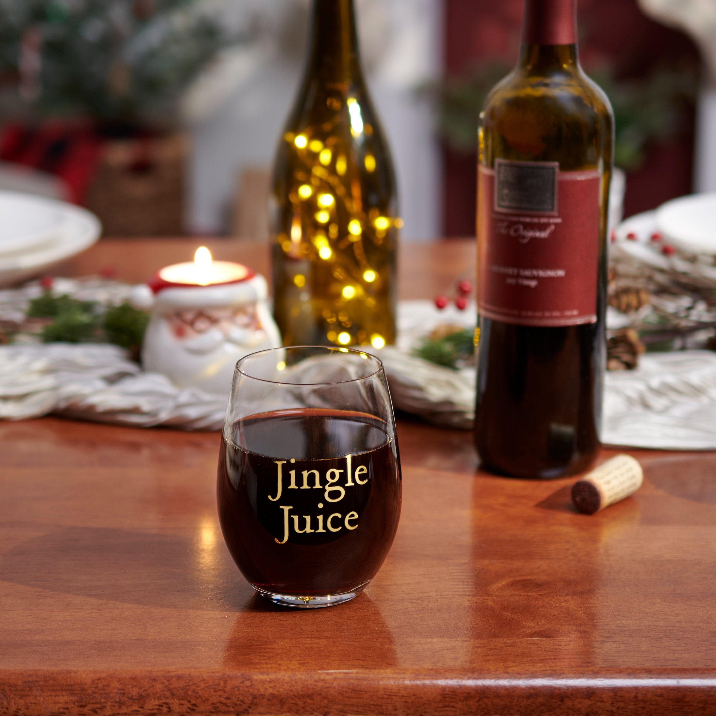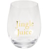 A 15 oz stemless wine glass from our Christmas Collection displaying a fun holiday sentiment in metallic gold that reads "Jingle Juice." Our Jingle Juice wine glass comes packaged in a high-quality giftable cylinder box showing full design in metallic foil. Hand-wash only. A fun seasonal piece of drinkware that is also great for gifting.