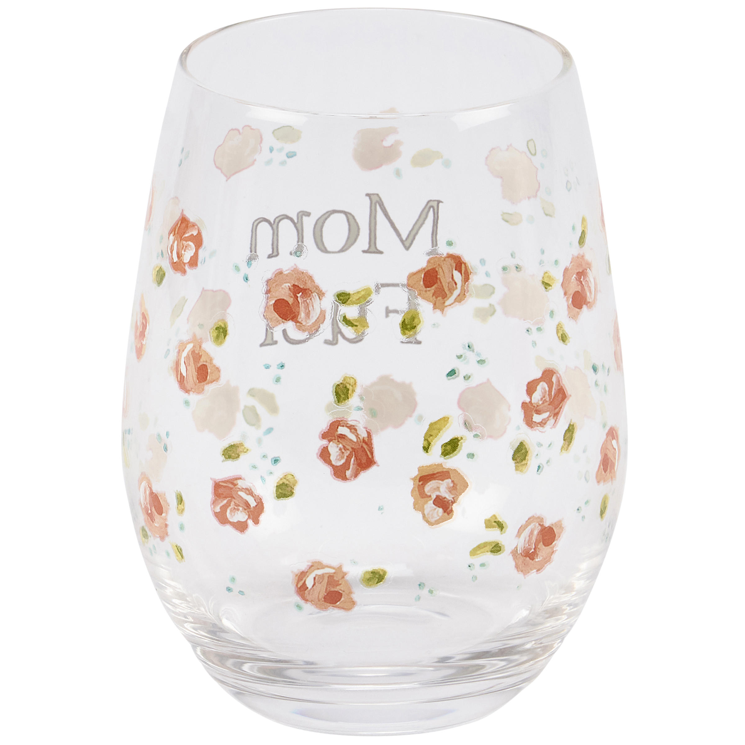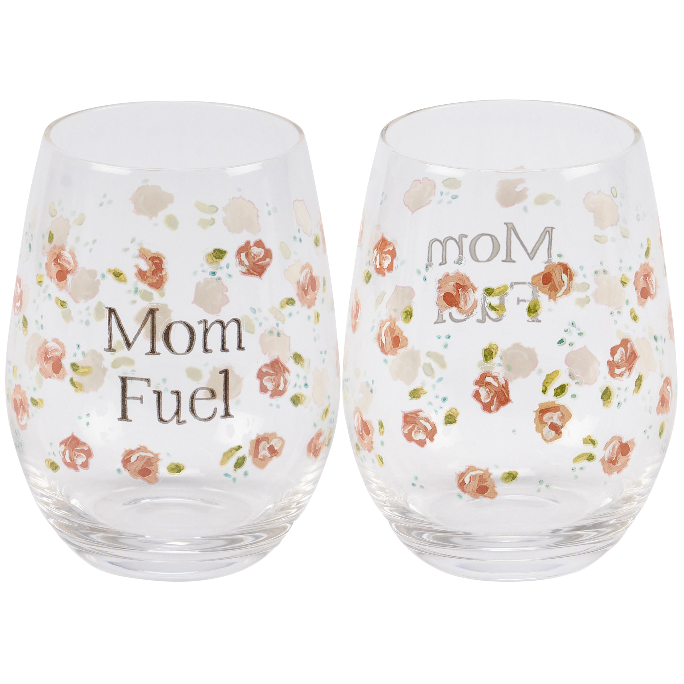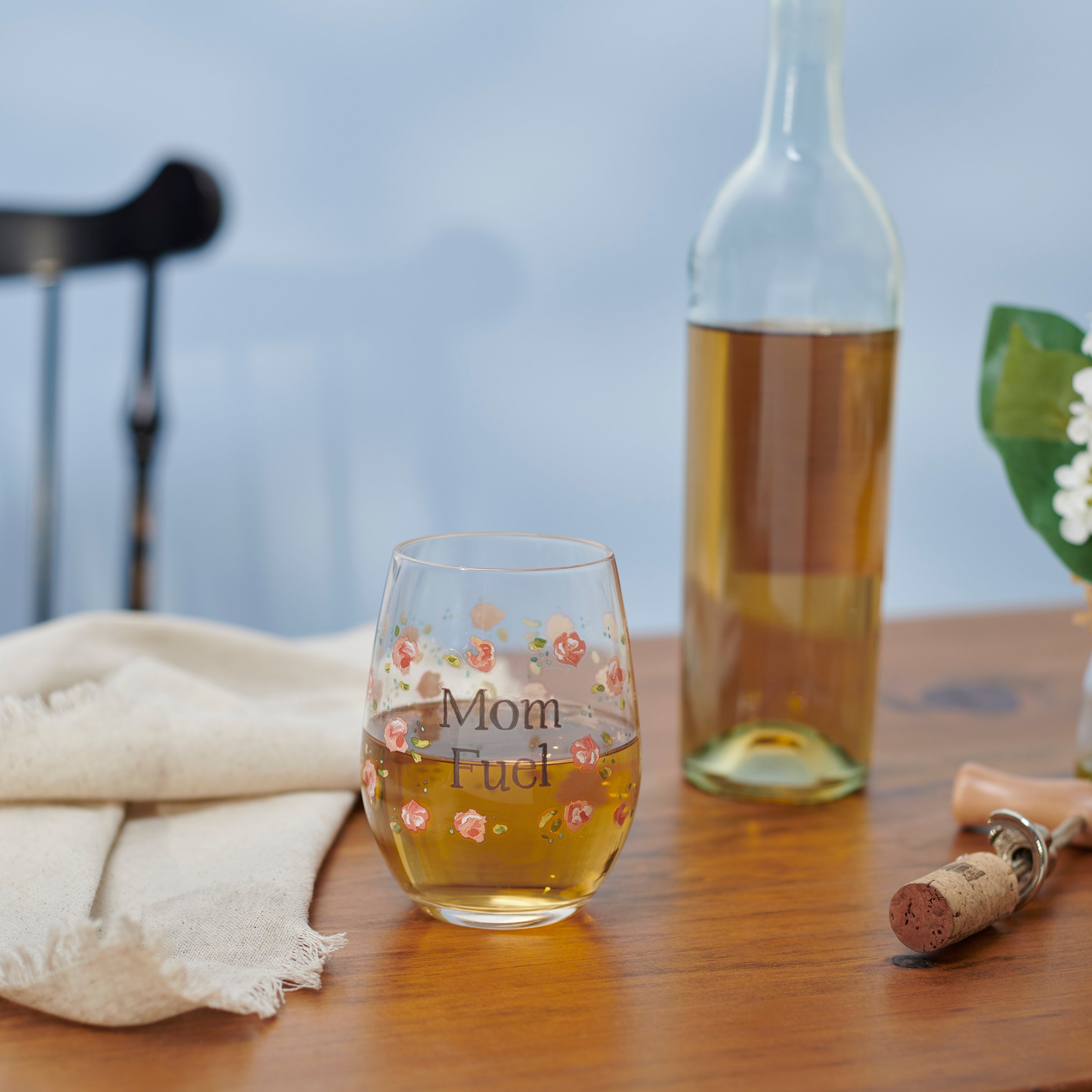 A 15 oz stemless wine glass from our Mother's Day Collection displaying a full color wrap-around design of pink flowers and fun mom inspired sentiment that reads "Mom Fuel" replicated from original hand painted art. Our Mom Fuel wine glass comes packaged in a high-quality giftable cylinder box showcasing design in full color. Hand-wash only. A fun Mother's Day gift perfect for everyday drinkware.