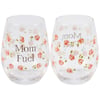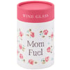 A 15 oz stemless wine glass from our Mother's Day Collection displaying a full color wrap-around design of pink flowers and fun mom inspired sentiment that reads "Mom Fuel" replicated from original hand painted art. Our Mom Fuel wine glass comes packaged in a high-quality giftable cylinder box showcasing design in full color. Hand-wash only. A fun Mother's Day gift perfect for everyday drinkware.