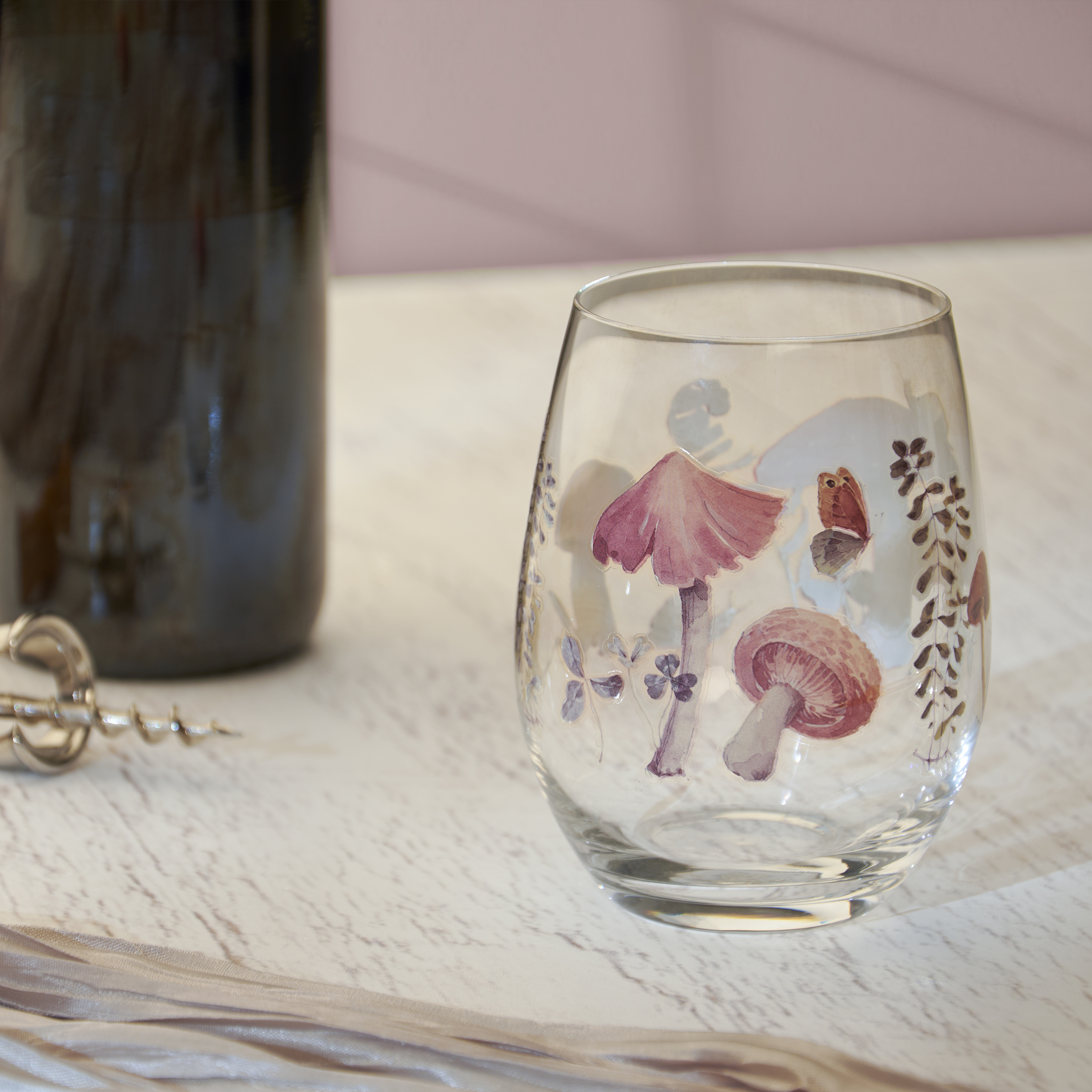 A 15 oz stemless wine glass from our Cottagecore Collection displaying a full color wrap-around design of mushrooms with nature accents replicated from original hand painted art. Our Mushroom Study wine glass comes packaged in a high-quality giftable cylinder box showcasing design in full color. Hand-wash only. A charming drinkware option that is also great for gifting.