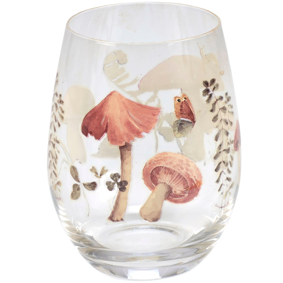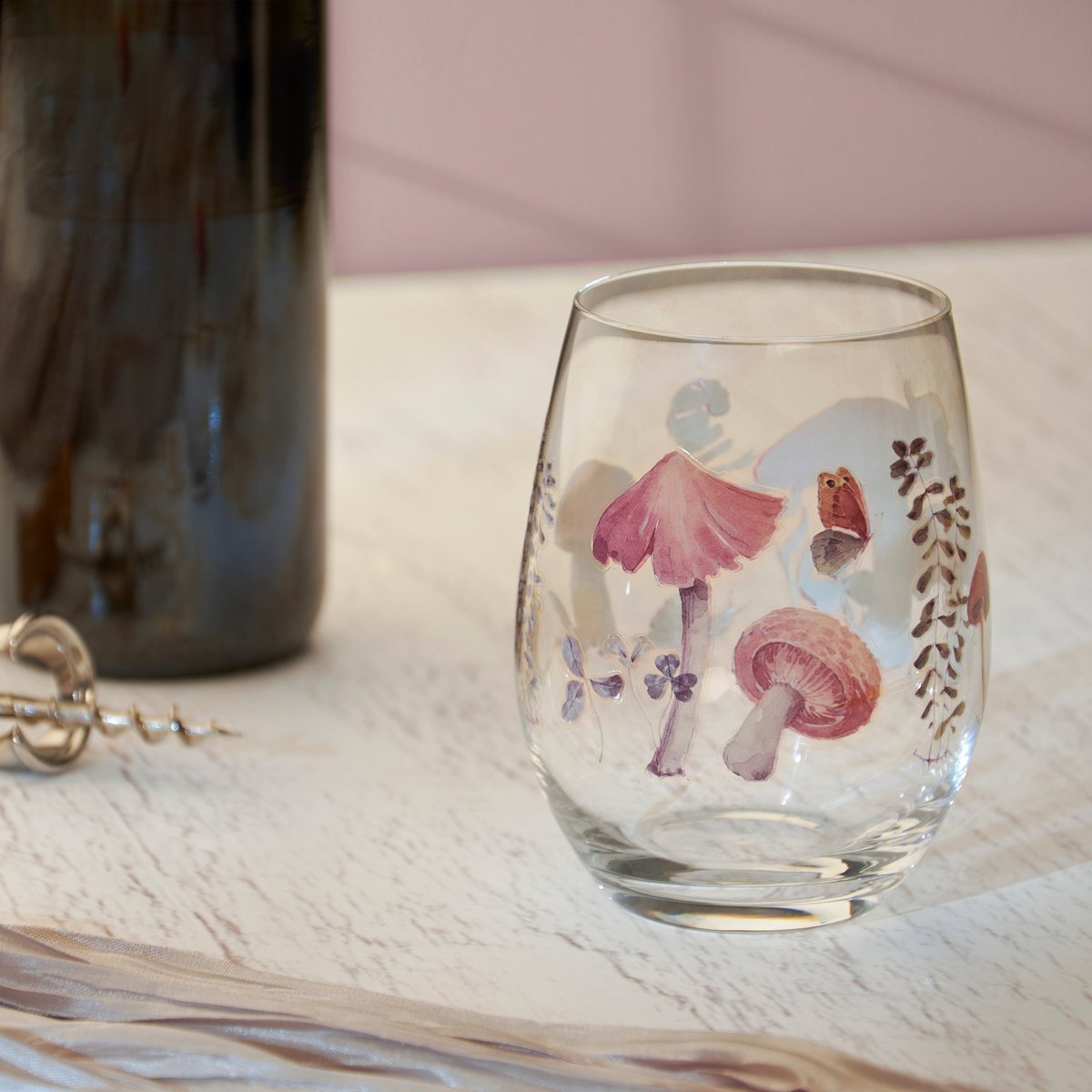 A 15 oz stemless wine glass from our Cottagecore Collection displaying a full color wrap-around design of mushrooms with nature accents replicated from original hand painted art. Our Mushroom Study wine glass comes packaged in a high-quality giftable cylinder box showcasing design in full color. Hand-wash only. A charming drinkware option that is also great for gifting.