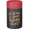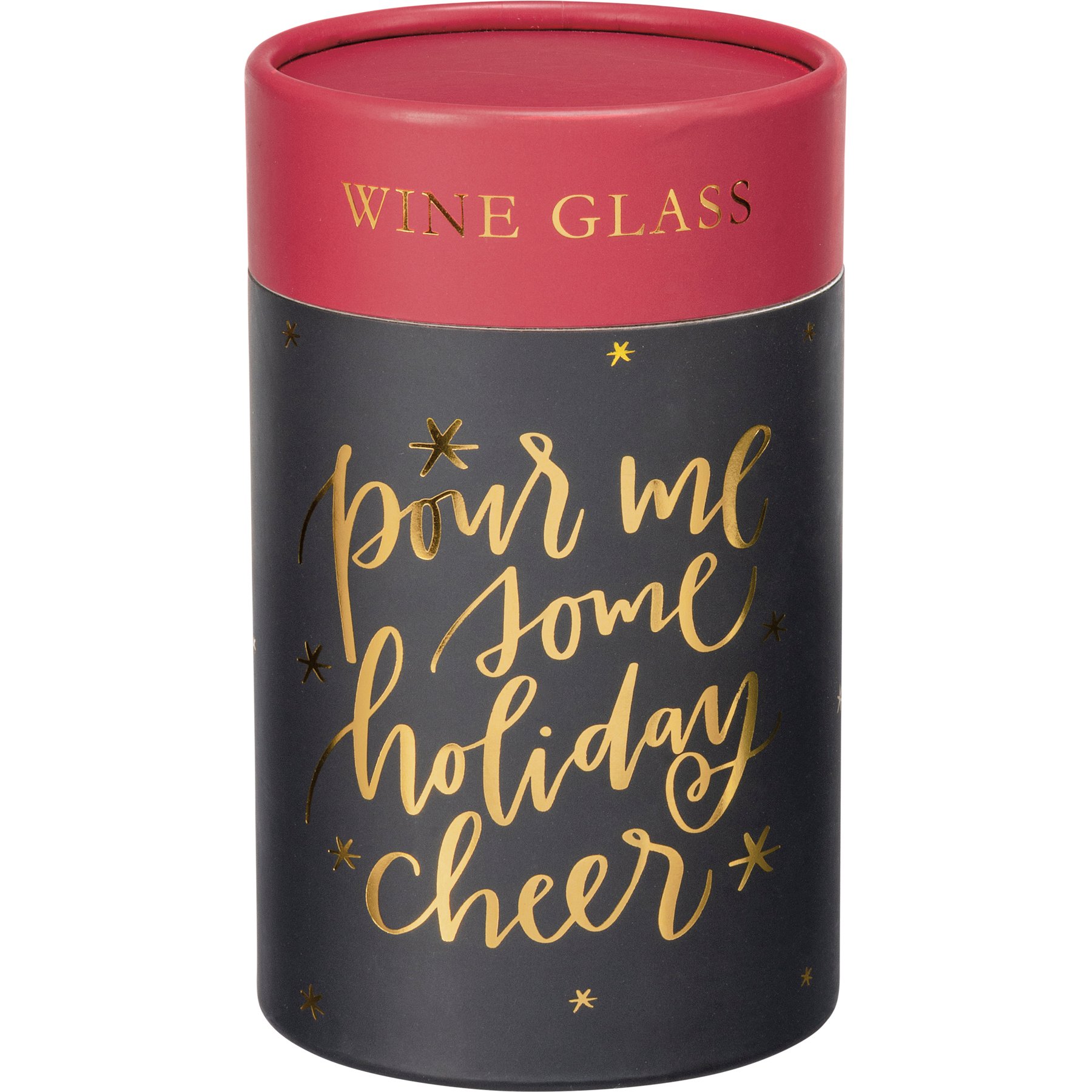A chic stemless wine glass featuring a metallic hand lettered "Pour Me Some Holiday Cheer" sentiment. Hand wash only; holds 15 oz. Comes packaged in a sturdy, high-quality cylinder box showing full design in metallic foil.