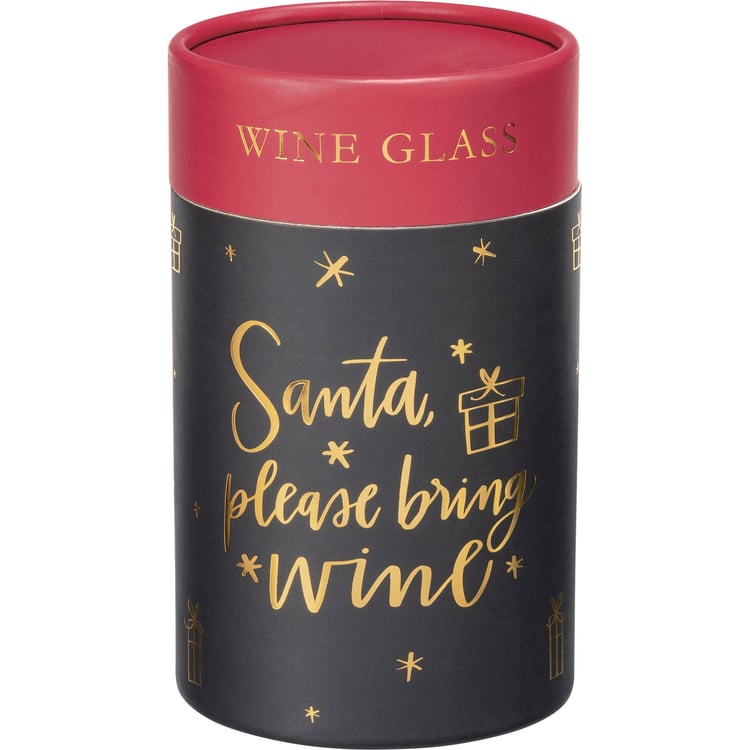 A chic stemless wine glass featuring a metallic hand lettered "Santa, Please Bring Wine" sentiment. Hand wash only; holds 15 oz. Comes packaged in a sturdy, high-quality cylinder box showing full design in metallic foil.