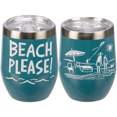 A stainless steel wine tumbler featuring a hand lettered "Beach Please!" sentiment with full wrap-around beach-themed design. Holds 12 ounces. Our Beach Please wine tumbler is insulated to keep beverages cold for 8 hours and hot for 4 hours. Includes plastic lid. Hand-wash recommended. Packaged in a kraft paper box.