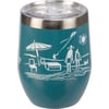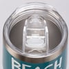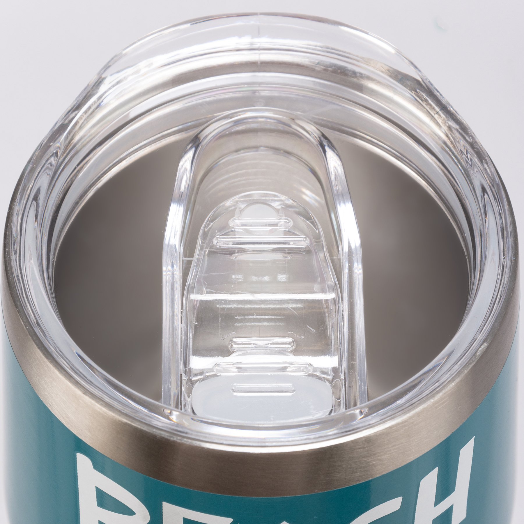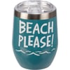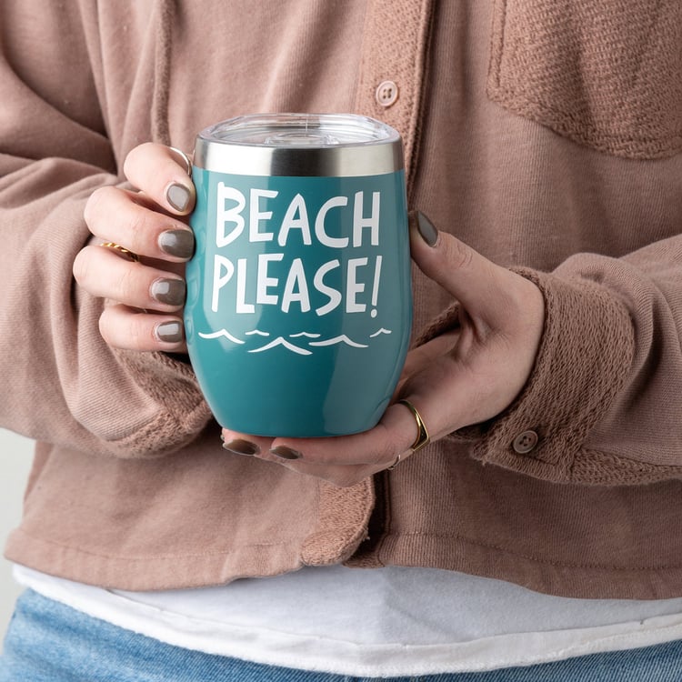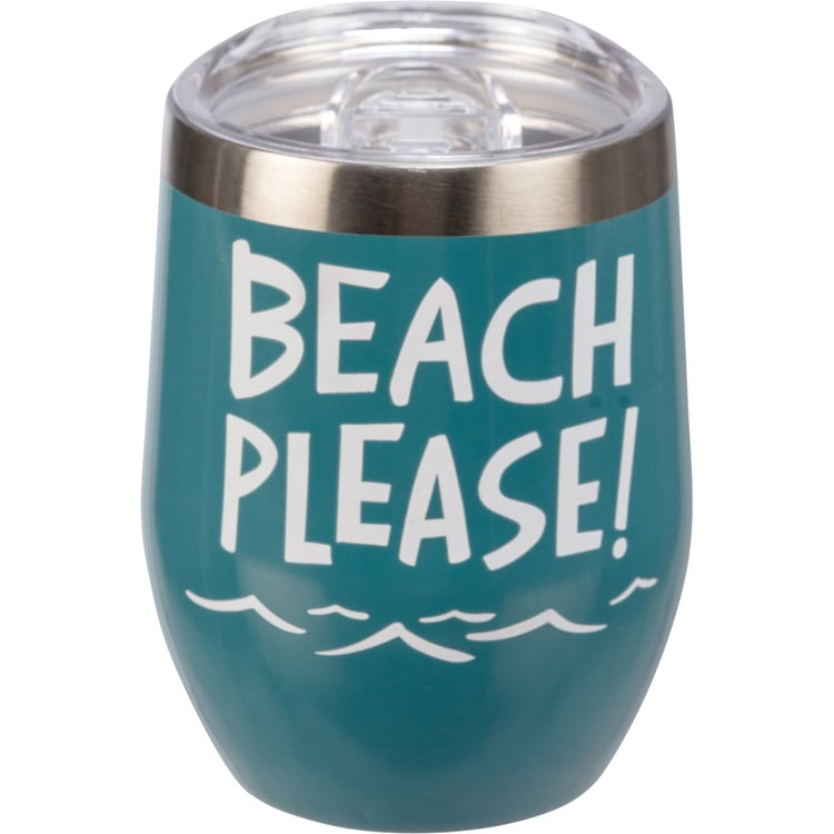 A stainless steel wine tumbler featuring a hand lettered "Beach Please!" sentiment with full wrap-around beach-themed design. Holds 12 ounces. Our Beach Please wine tumbler is insulated to keep beverages cold for 8 hours and hot for 4 hours. Includes plastic lid. Hand-wash recommended. Packaged in a kraft paper box.