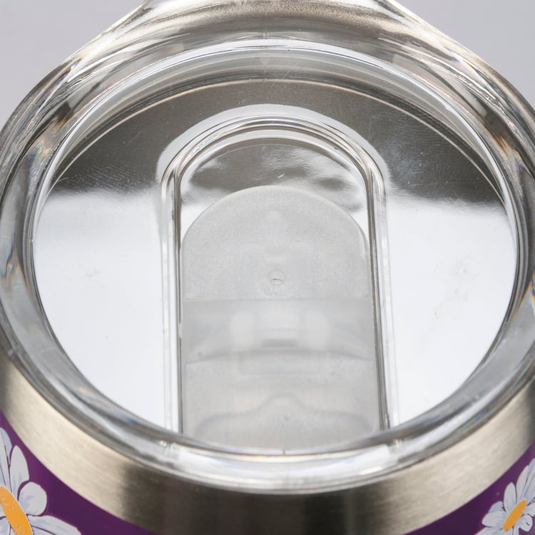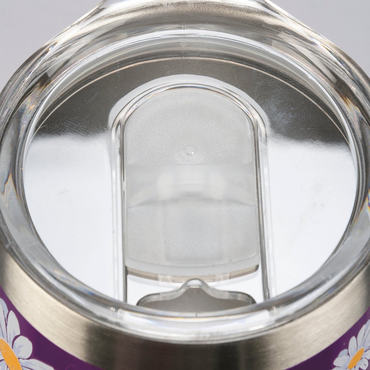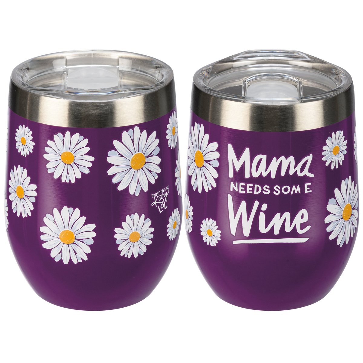 A stainless steel wine tumbler featuring "Mama Needs Some Wine" sentiment with colorful full wrap-around daisy designs. Holds 12 oz. Includes plastic lid and is insulated to keep beverages cold for 8 hours and hot for 4 hours. Hand-wash recommended. Packaged in a kraft paper box.