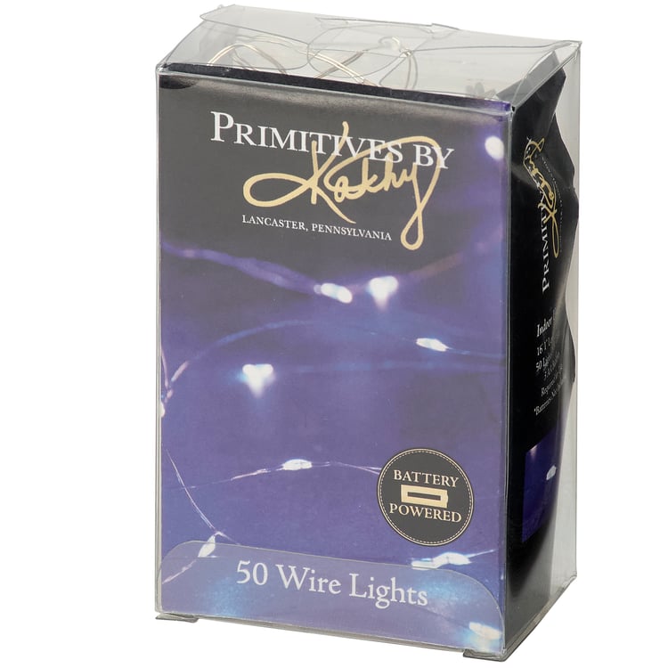 A set of wire lights from our Halloween Collection featuring fun spooky purple lights throughout. Seasonal wire light includes 50 lights along a 193 inch wire attached to power source and 12 inch cord. Our Purple wire lights feature a convenient 6 hour timer and runs on 3 AA batteries. Batteries not included. Indoor use only. Packaged in an acrylic box with insert displaying working lights and product information. A fun Halloween home accent perfect for adding seasonal mood lighting to any room.