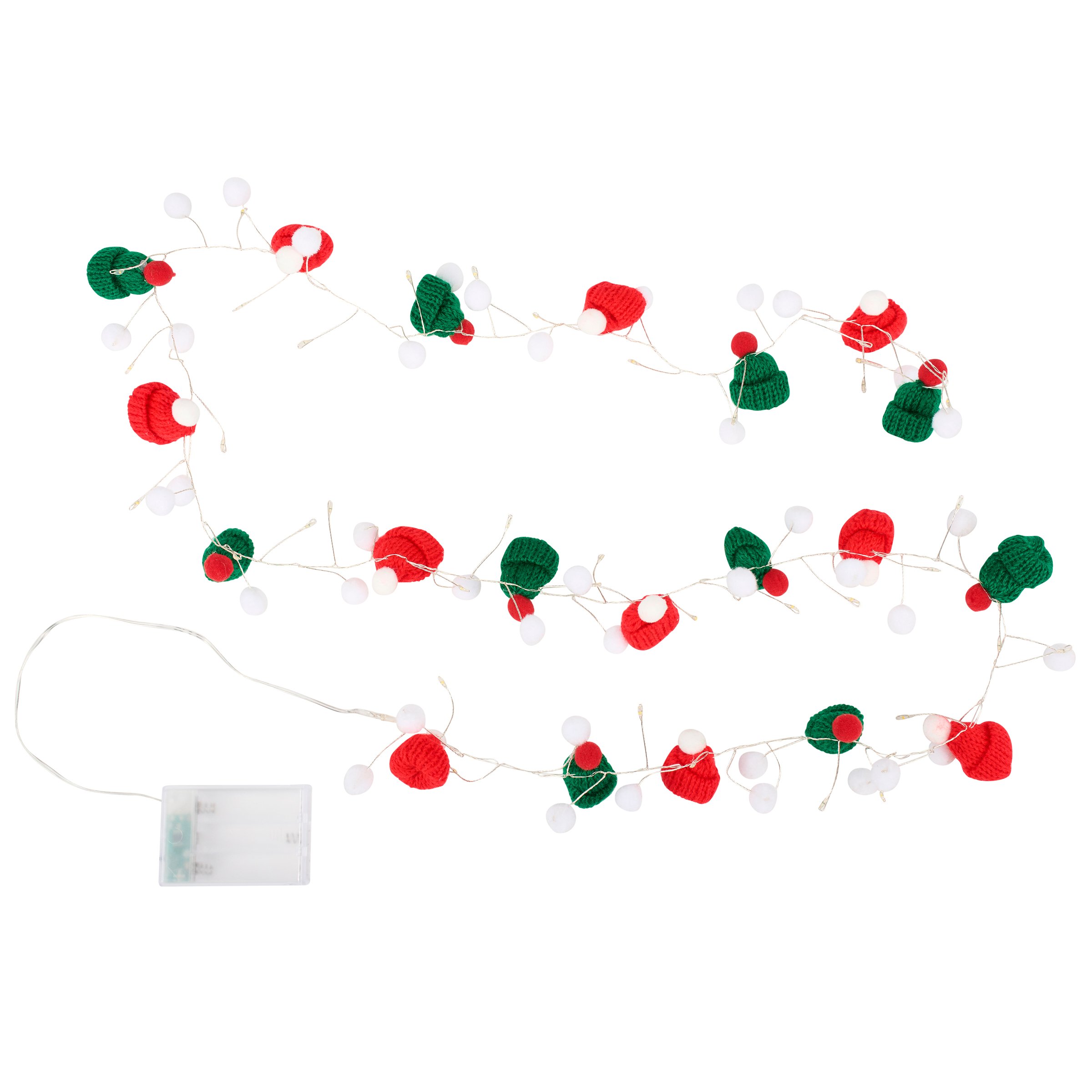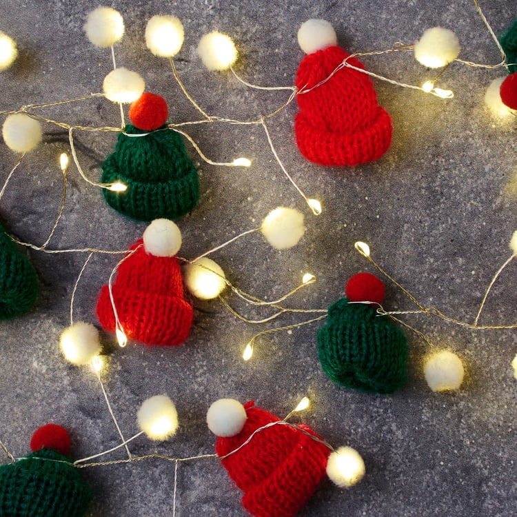 A set of string lights from our Christmas Collection featuring red and green winter beanies in a hand knit style accented with wire lights. This set of Christmas string lights includes 80 lights along a 59 inch wire attached to power source and 13 inch cord. Our Winter Beanies string lights feature a convenient 6 hour timer powered by 3 AA batteries (not included). Indoor use only. Seasonal lights are packaged in an acrylic box with insert displaying working lights and product information. A Christmas home accent perfect for adding seasonal lighting to any room or mini Christmas tree.